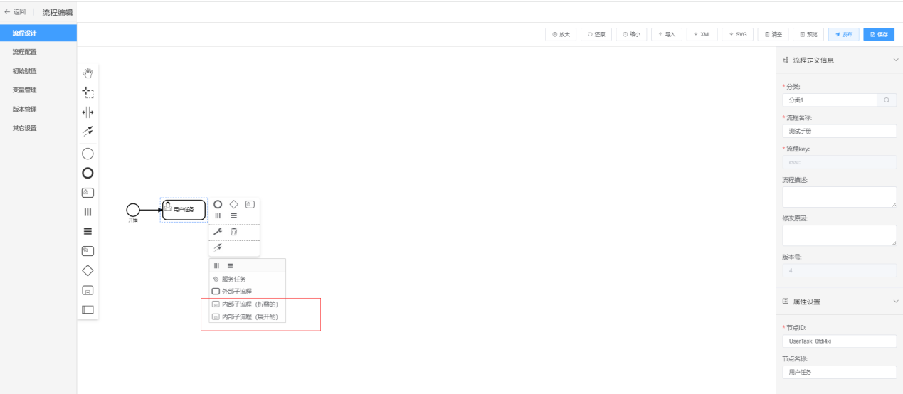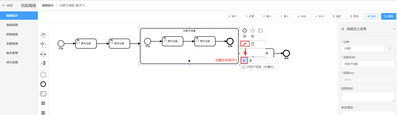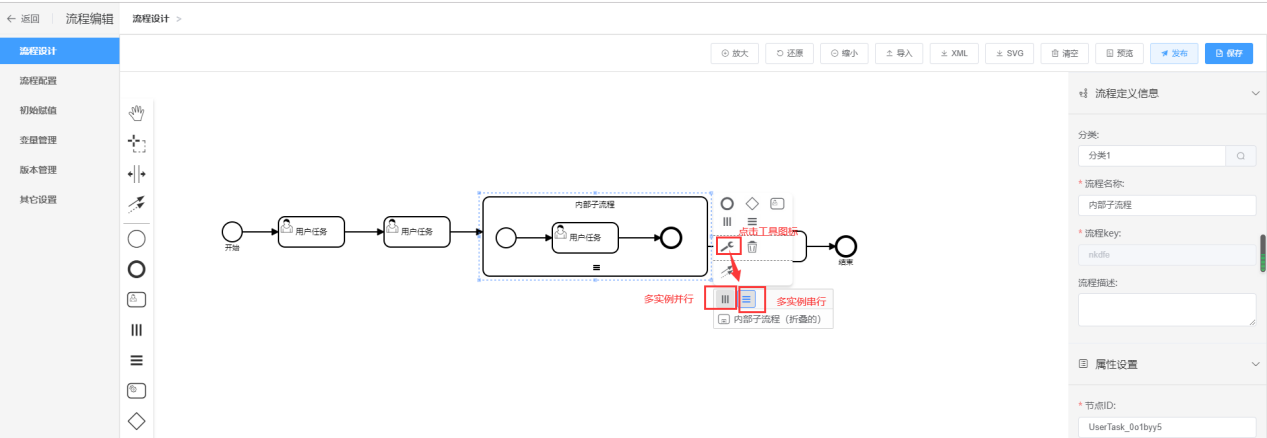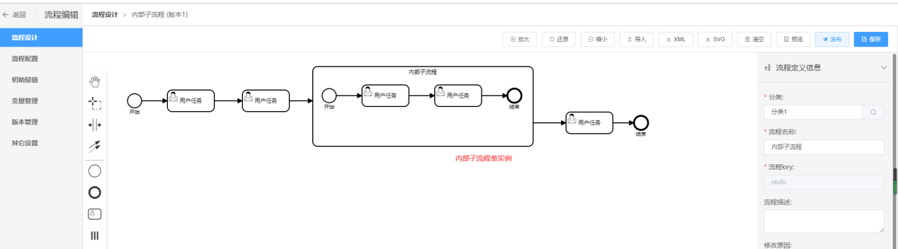 流程的内部子流程的流程图需要用户自己设计,内部子流程可以多实例也可以单实例 |