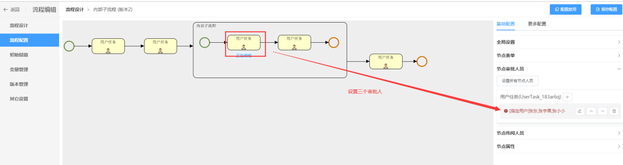下图中的将内部子流程拖到设计页面,该实例类型就为单实例,在流程设置中设置内部子流程第一个节点的审批人员有三个,分别是张东,张宇果,张小小,如下图所示: