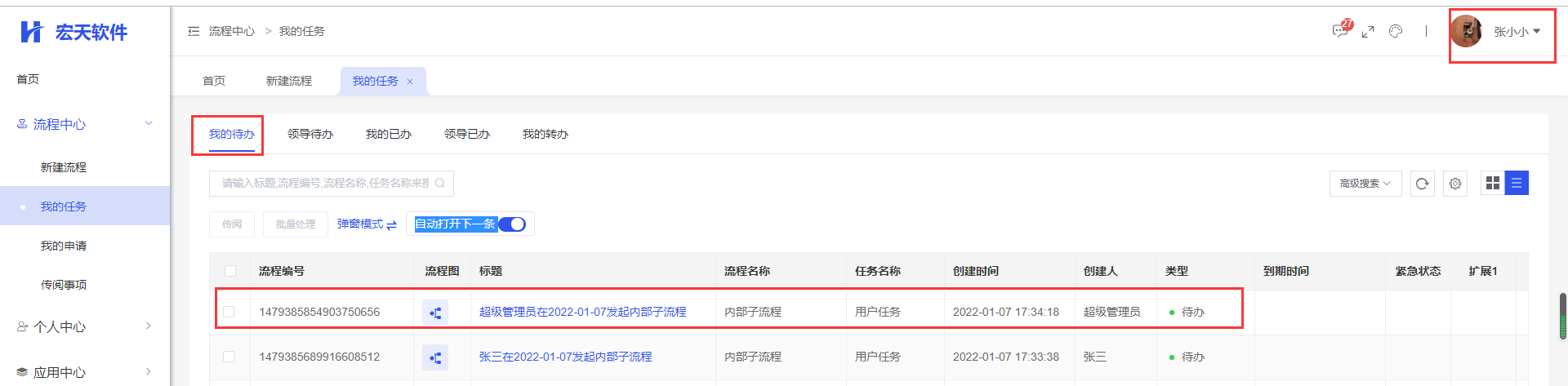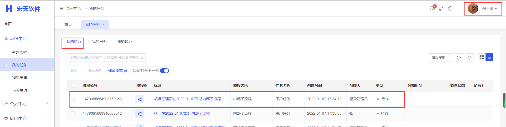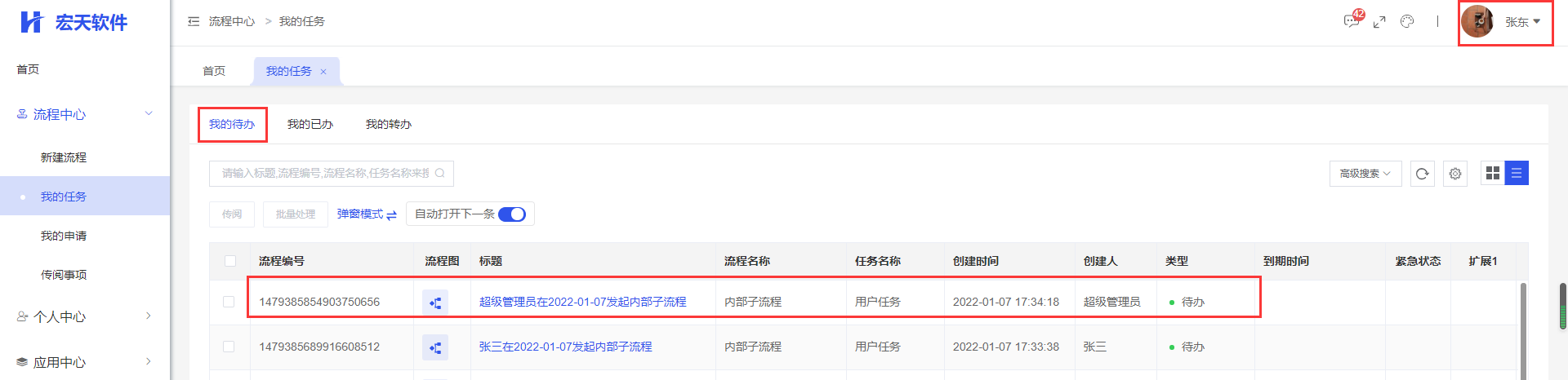启动流程,流程运行到内部子流程第一个节点时,可以看到内部子流程只有一条任务,子流程第一个节点任务的待执行人有三个,这三个人员的【我的待办】中都有这该条任务的待办,他们对这个任务的审批是抢占式的,即其中一个审批后,其他两个人员的【我的待办】中不再有该条任务。