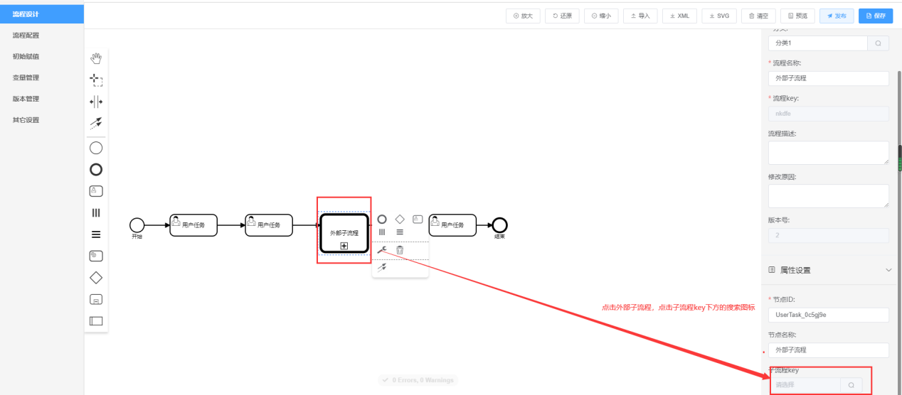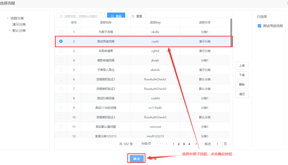 选择子流程:点击子流程KEY下方的“选择”按钮,在“选择流程”弹出框中选择流程,然后点击“确定”按钮,选择的流程的KEY显示在文本框中,即该流程作为主流程的外部子流程。如下所示: