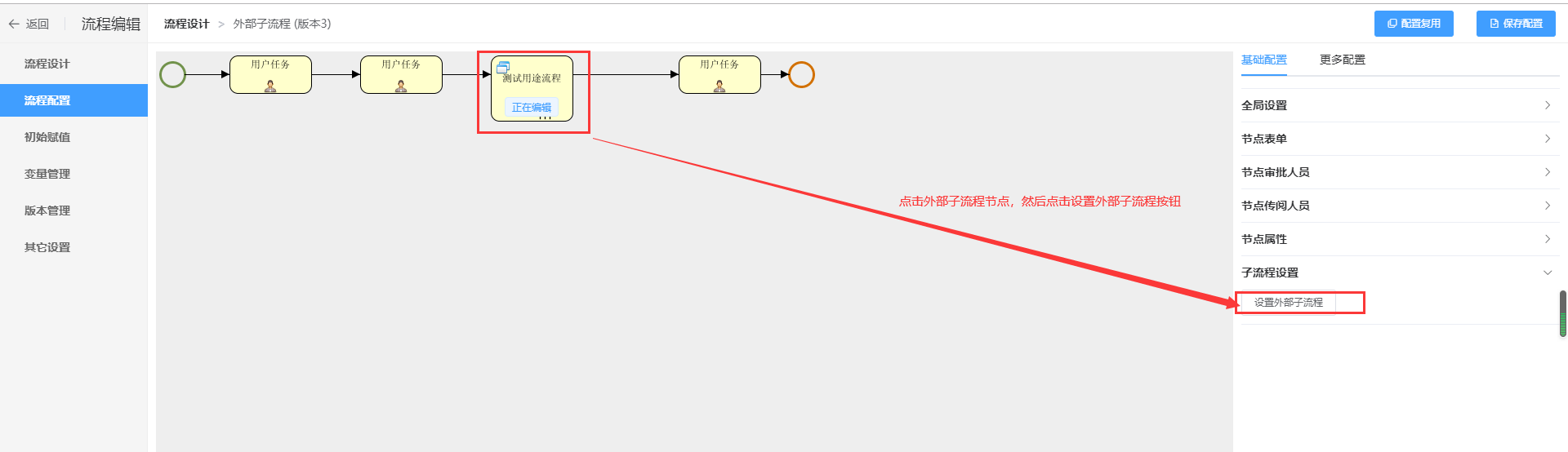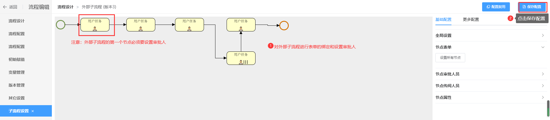 在【流程配置】页面,绑定主流程表单和审批人信息后,点击保存配置,然后点击设置外部子流程,操作如下所示: