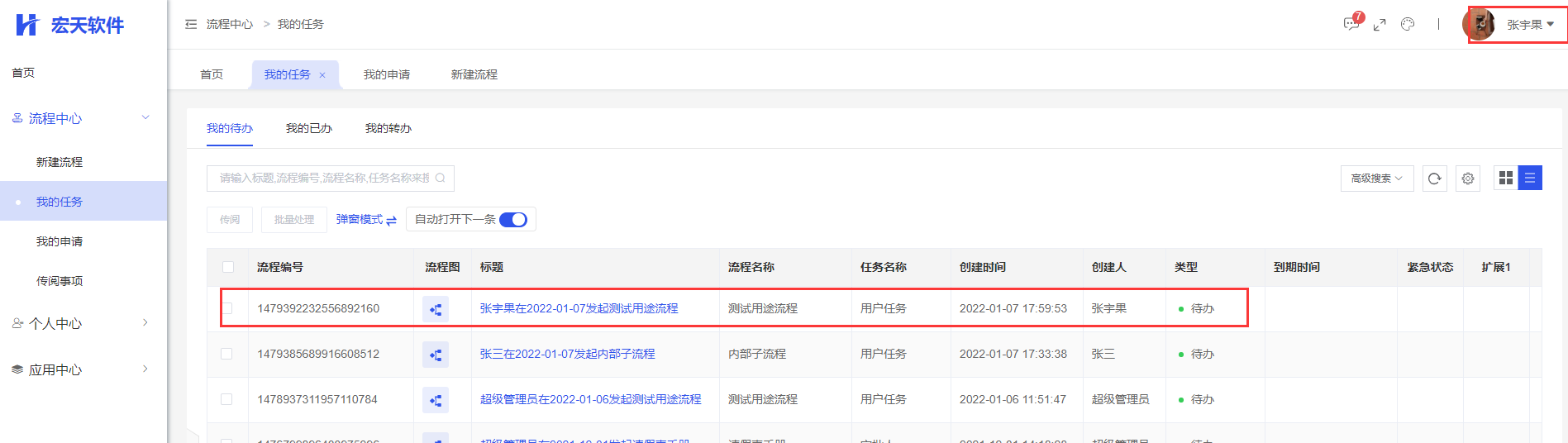 当张宇果用户审批完该任务: