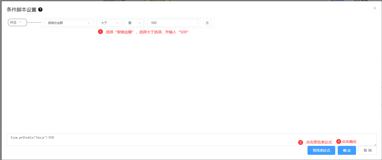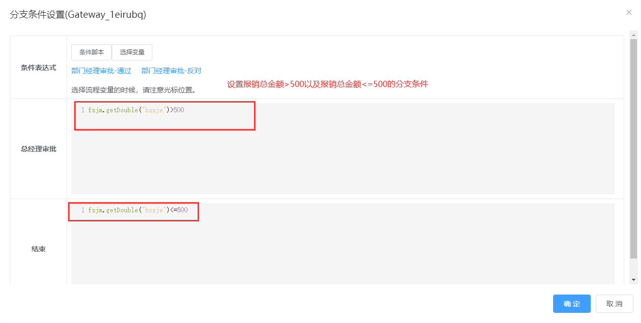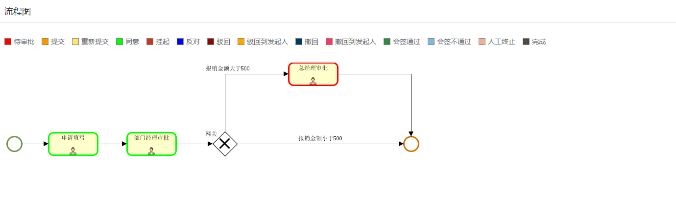 示例说明:表单字段“报销总金额”大于500时,需要总经理审批;“报销总金额”小于500,则结束流程,流程图如下所示: