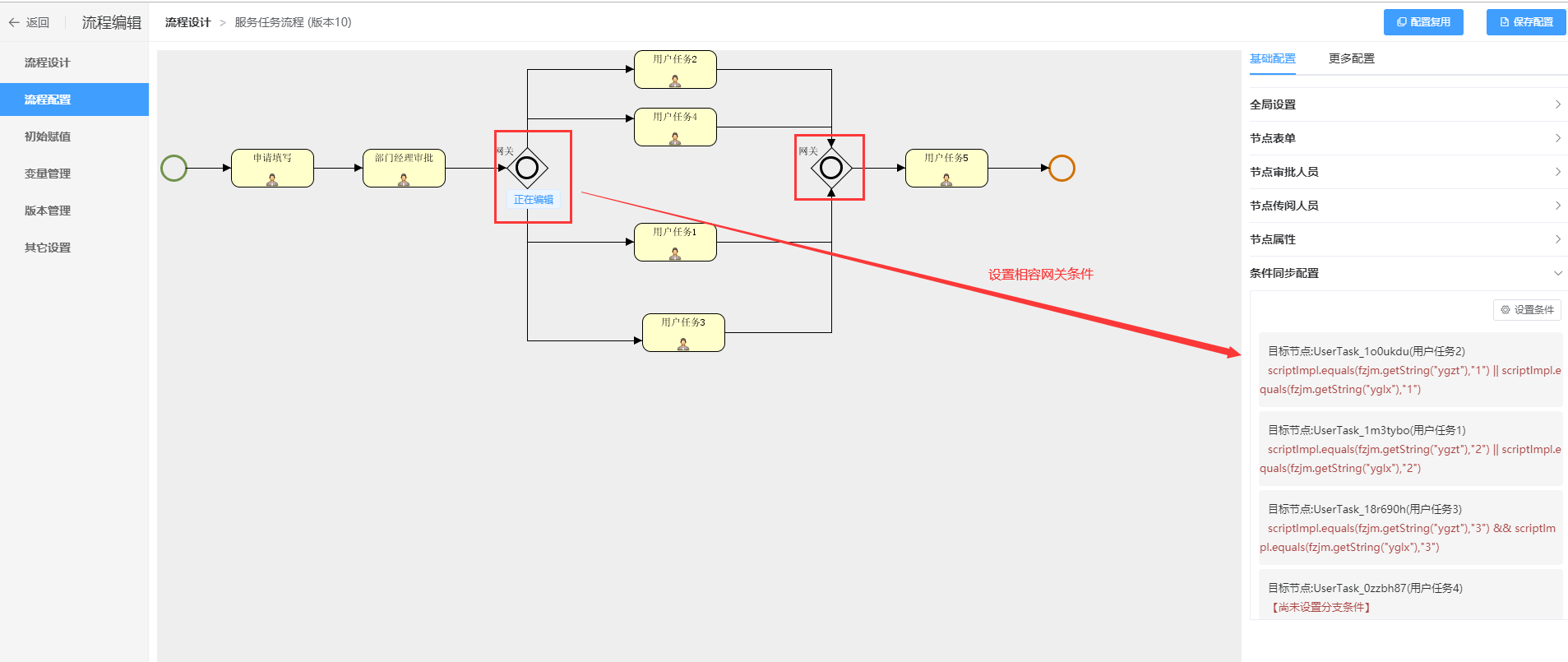 相容网关:相容网关也是必须要成对使用,与并行网关不同的是,并行网关中的每条分支都会执行,相容网关是根据设置的条件选择走哪条分支,可能是多条分支也可能是一条分支,若走多条分支则每条分支都执行完后流程才能通过相容网关走向下一个节点。若没有设置条件并行网关的条件,则所有分支都要执行。