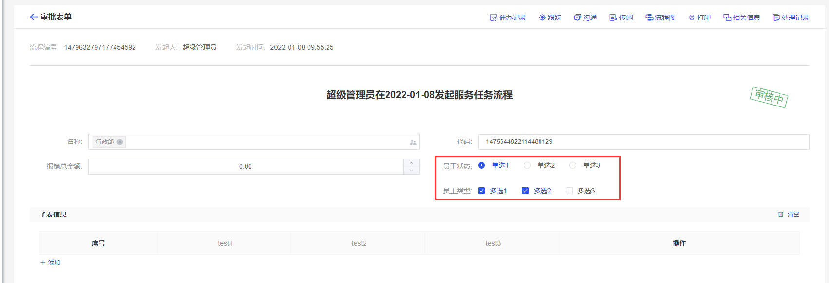 内部子流程在【节点信息】中设置子流程的实例类型,实例类型有单实例和多实例,实例类型选择多实例时,需要设置实例的串并行类型。如下所示: