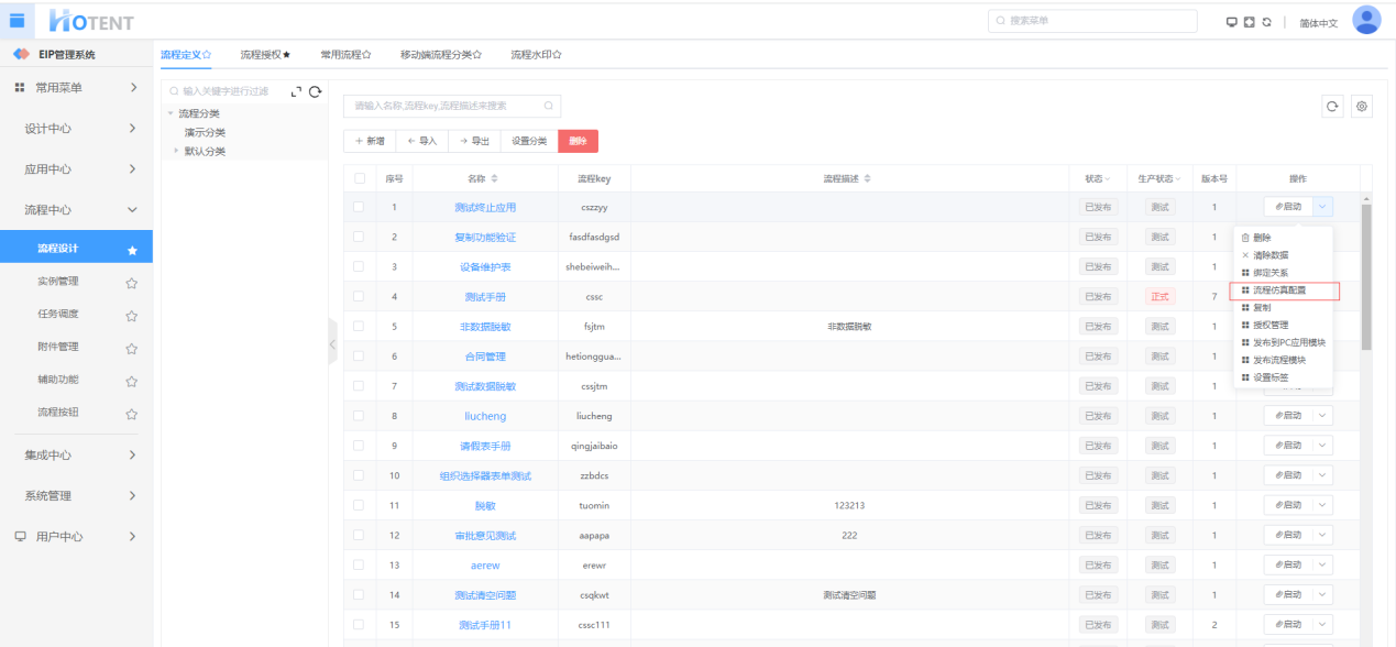 第一步:【流程中心】→【流程定义】,选择要验证的流程,点击【流程仿真配置】按钮;