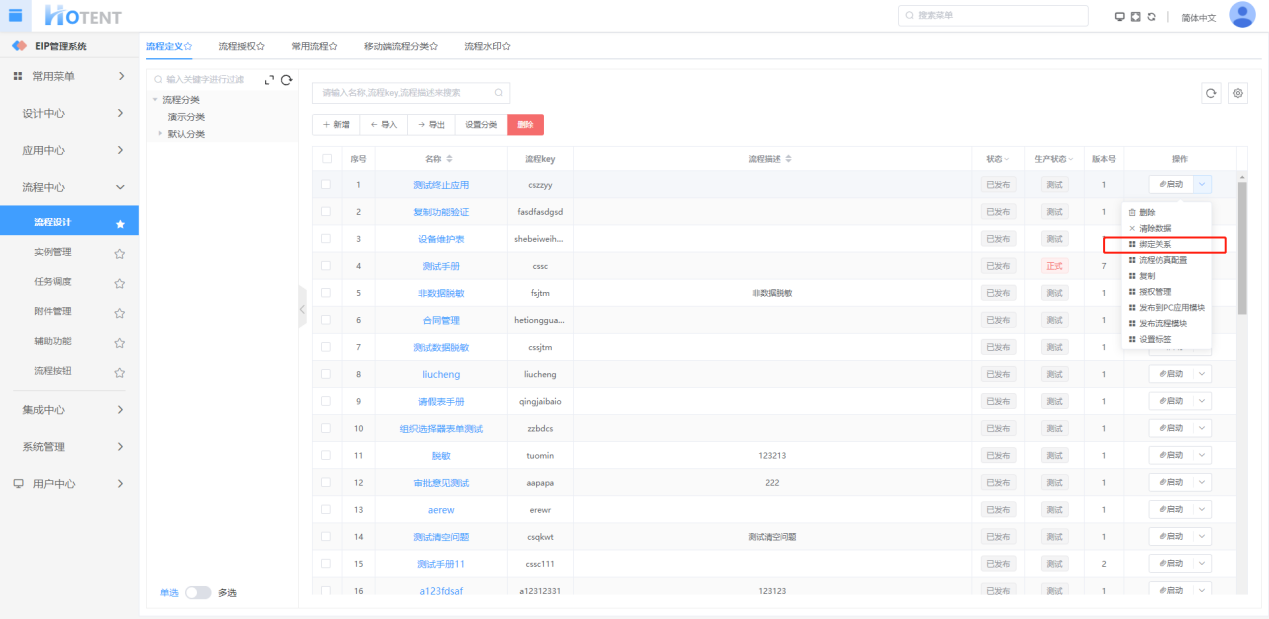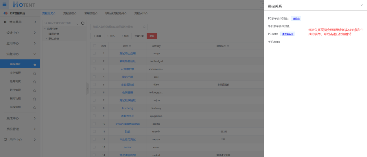 通过查看绑定关系,可以快速的查看流程中所用的表单和实体信息,方便进行信息查询