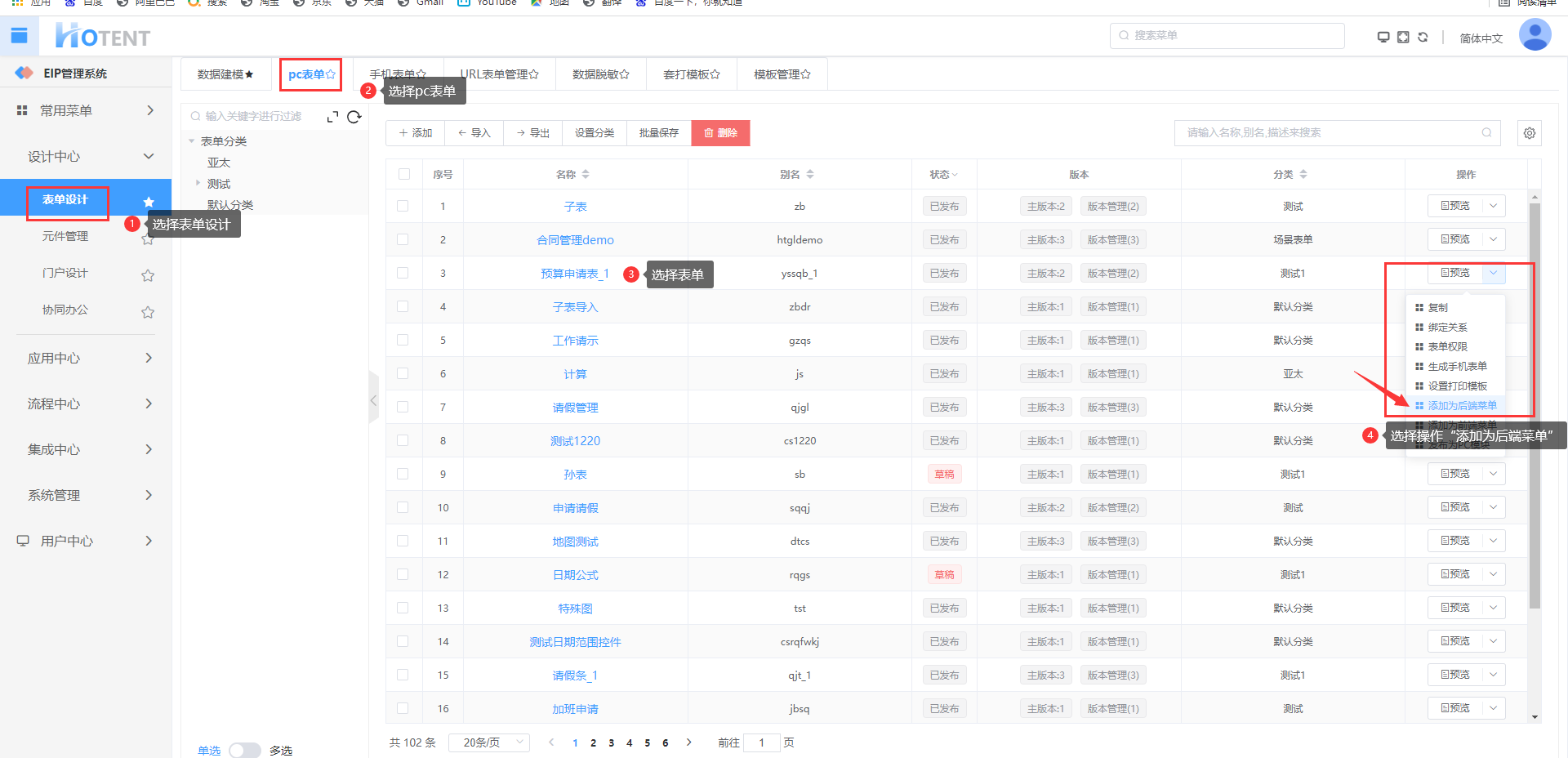 第一步:【设计中心】→【表单设计】→【PC表单】,选择表单点击“设置为后端菜单”操作