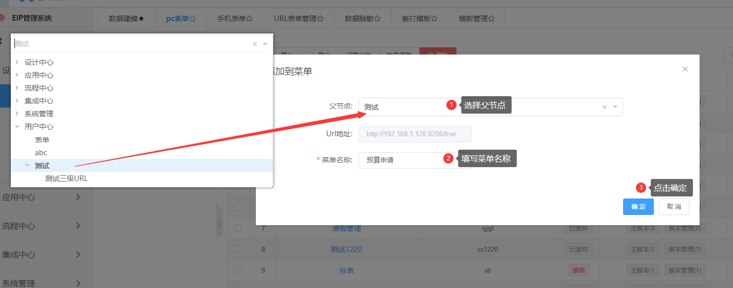 第二步:选择父节点和输入菜单名称,然后点击“确定”