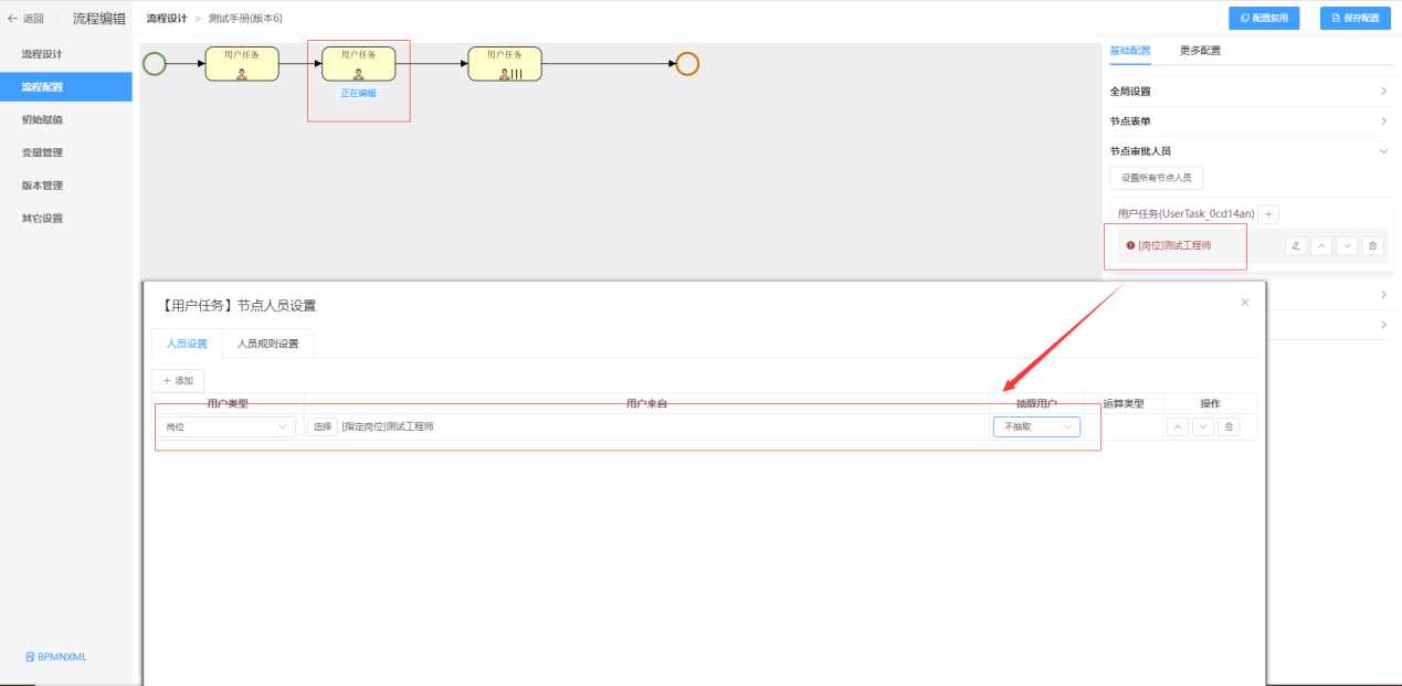 第二步:点击要配置审批人的节点,在右侧基础配置中点击节点审批人员;