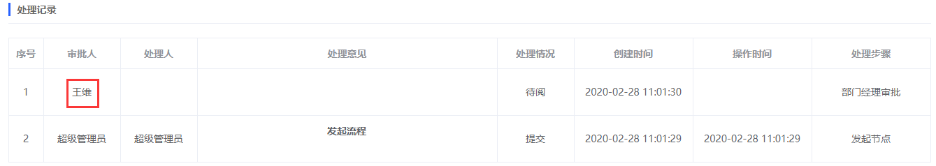 启动流程,流程运转到节点“部门经理审批”,可以看到节点“部门经理审批”的待执行人是“王维”,如下所示: