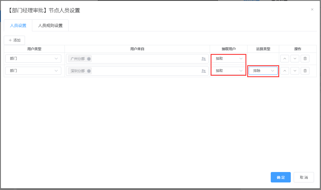 在节点“部门经理审批”节点人员设置弹框中,将第二条人员设置的“运算类型”改为“排除”,然后进行保存,如下所示: