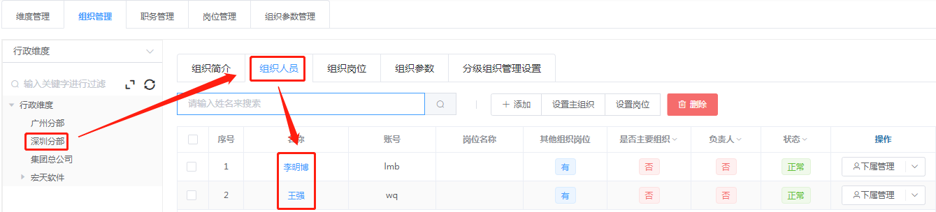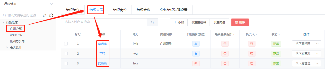 组织“广州分部”中有三个人员,组织“深圳分部”中有两个人员,排除部门“深圳分部”中的用户后,得到的人员是“韩晓晓”,如下所示: