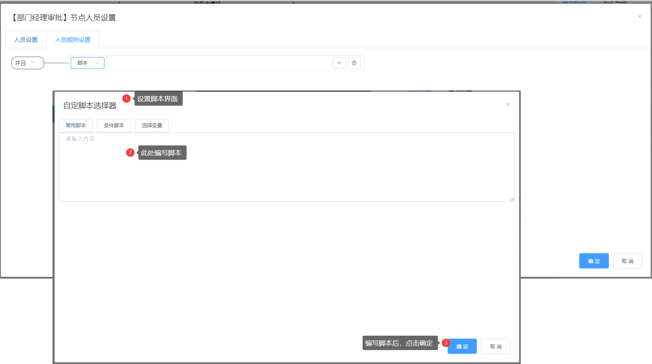 用户类型选择“人员脚本”,“用户来自”列显示“选择”按钮,点击“选择”按钮打开“人员脚本选择器”,在选择器的左边点击脚本,脚本显示在右边,设置脚本的参数值,然后点击“确定”按钮,如下所示: