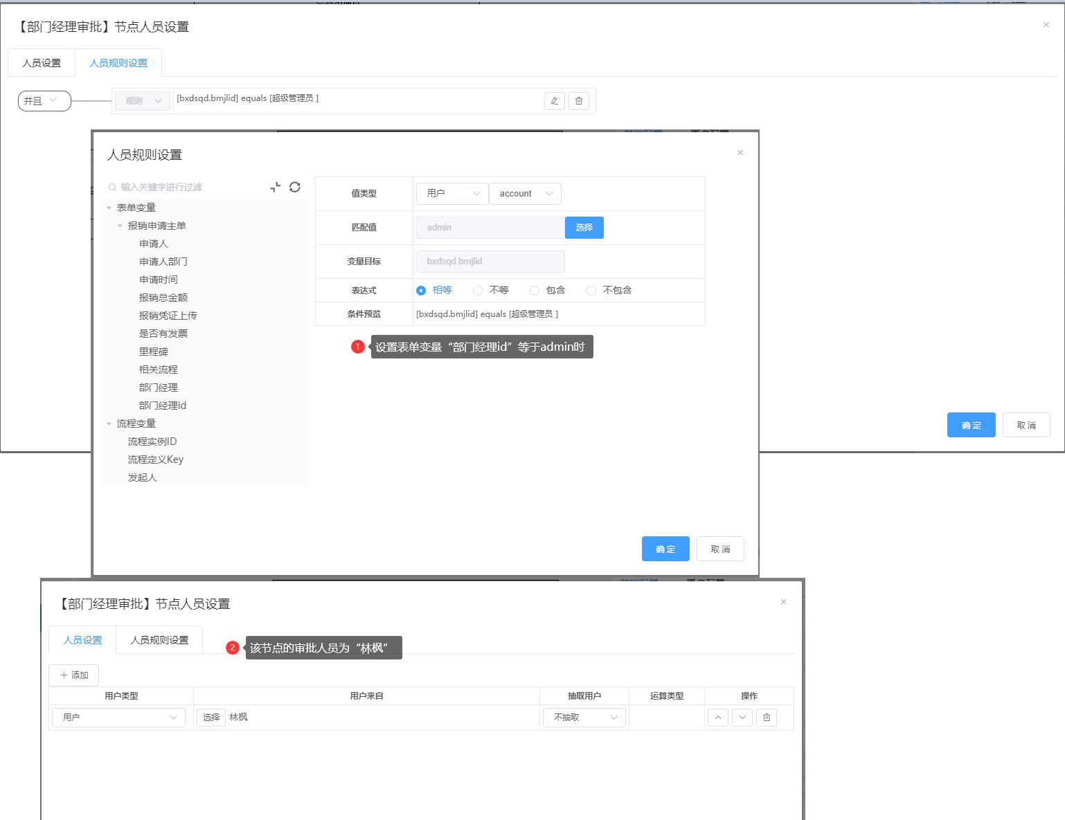 如下图设置的是当表单变量部门经理id为admin时,设置该节点的审批人为“林枫”: