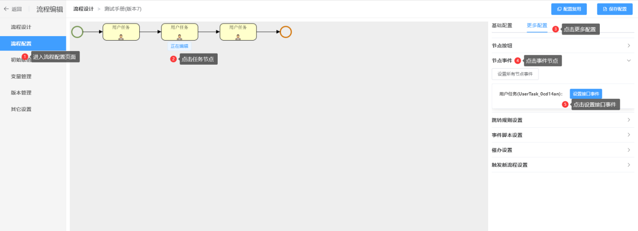 第二步:在右侧点击【更多配置】面板的【节点事件】