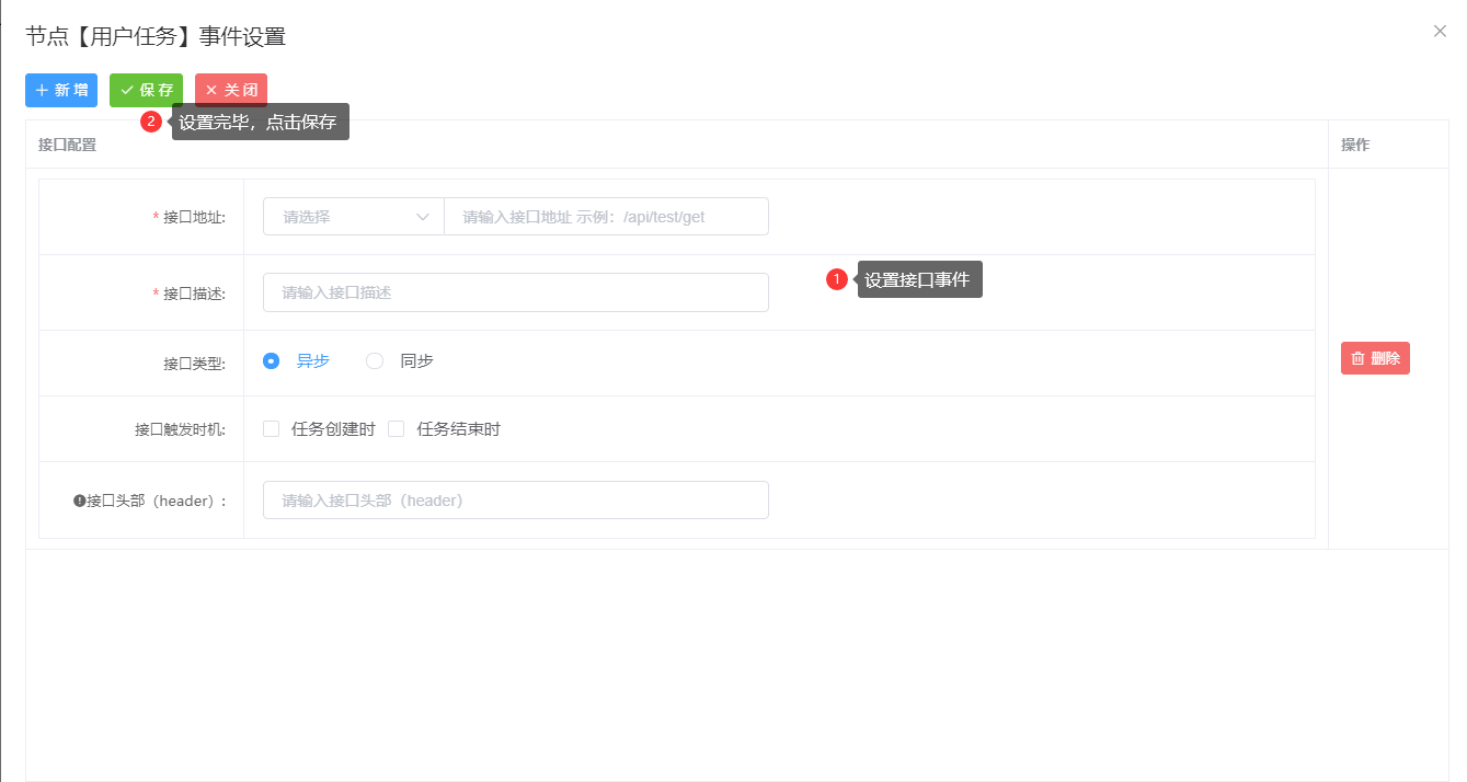 类型:选择事件的处理类型(异步:不管接口是否执行成功,都不影响流程流转;)