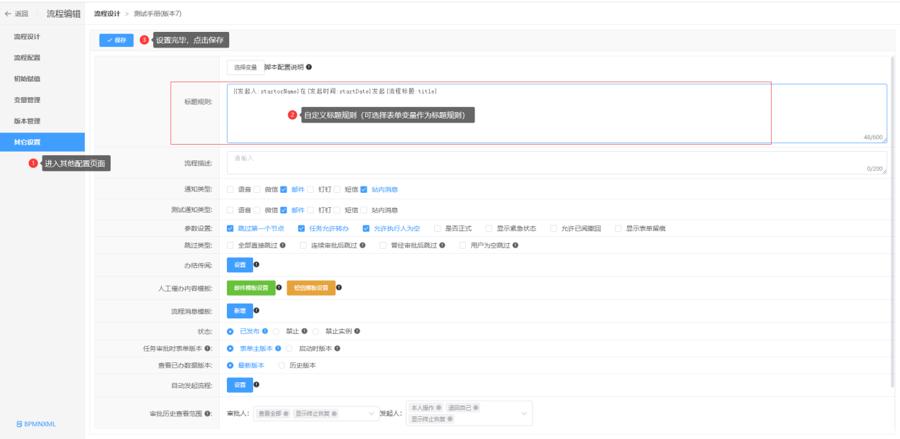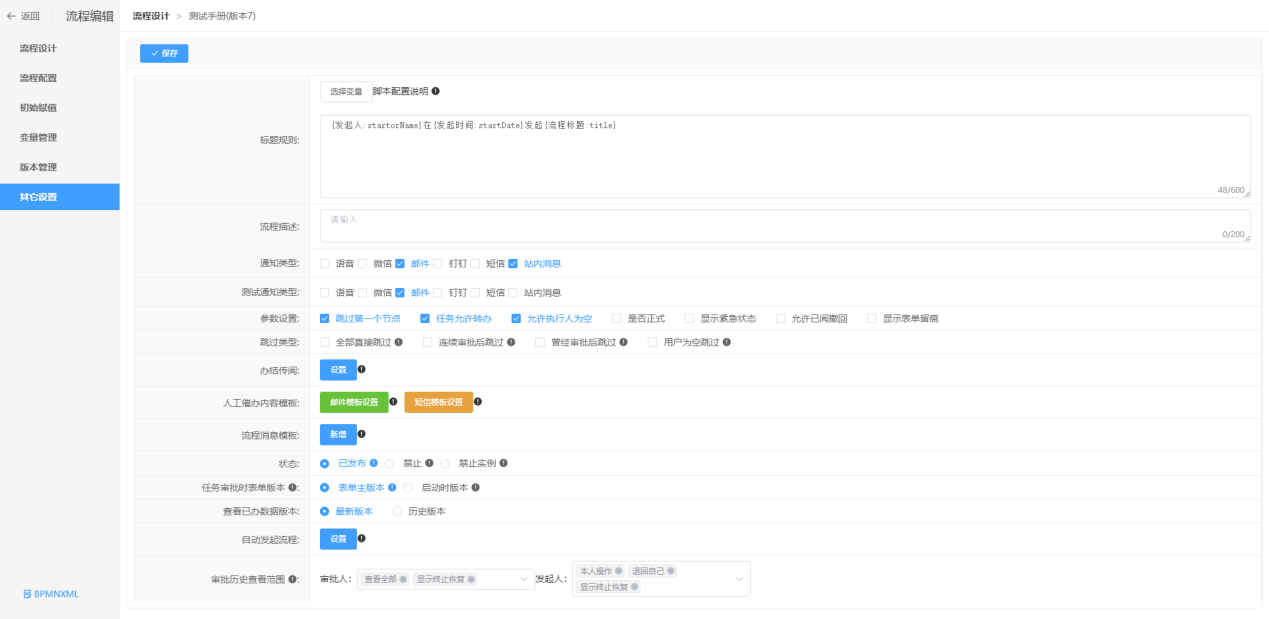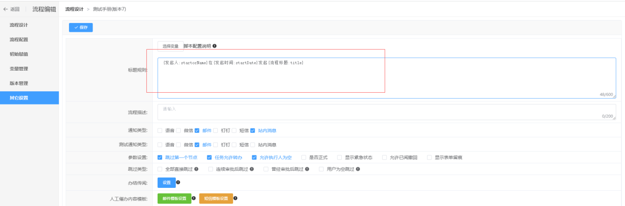 【其他设置】是对流程的其他属性进行设置的,例如流程标题、流程描述、通知类型、跳过类型等,下面分别进行说明。