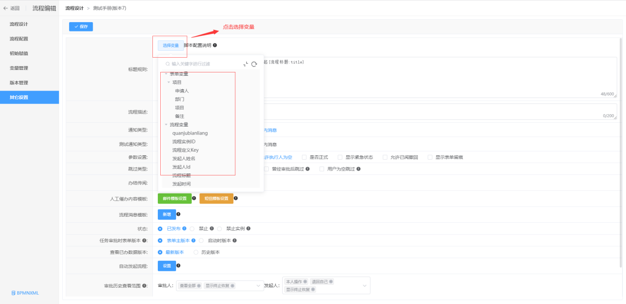 在标题规则中设置流程的标题,这里设置的标题作为流程实例标题和任务标题。如下所示: