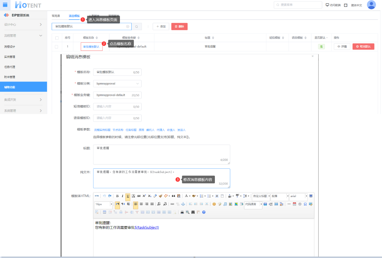 4、发送消息模板设置,可在【辅助功能】->【消息模板】中修改,下面以待办的消息为例: