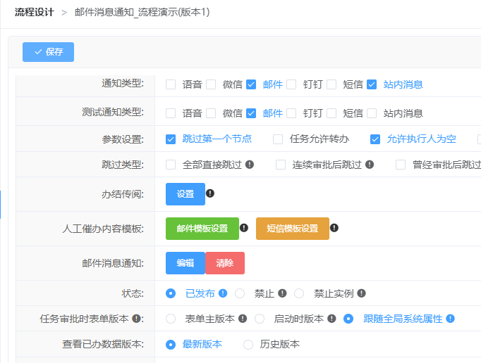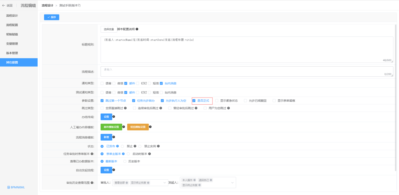 测试通知类型: 流程产生待办时的通知类型(用于测试流程,即“生产状态”处于测试的流程)(此处设置测通知类型,在每个节点产生的待办都会发送消息通知给待审批人)。