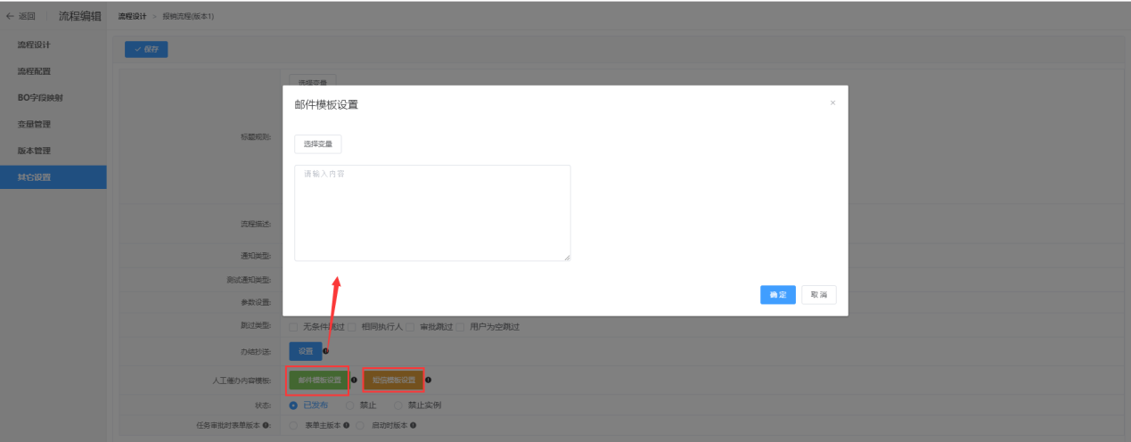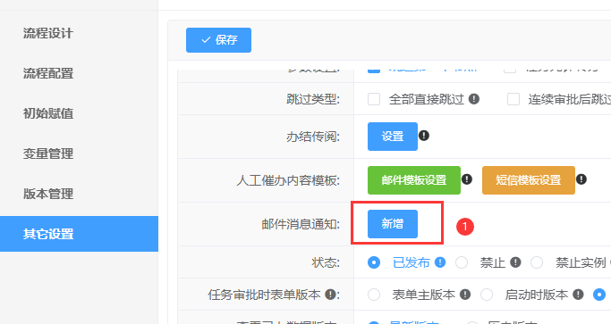在流程设计-【其他设置】-邮件消息通知-点击新增