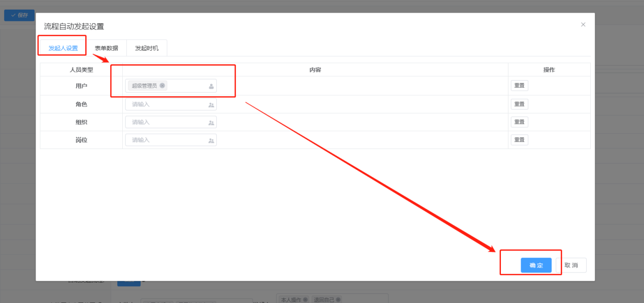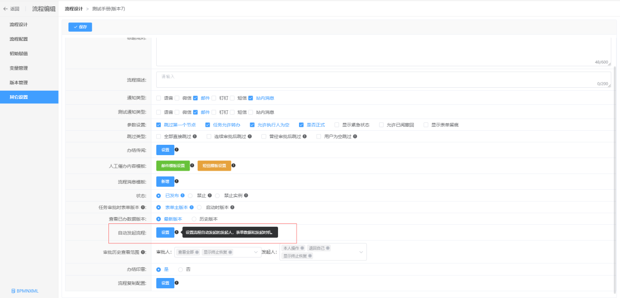 自动发起流程:设置流程自动发起的发起人,表单数据和发起时机。