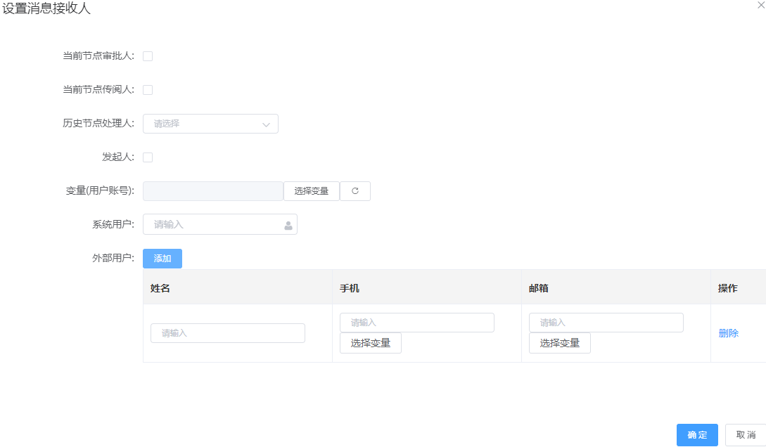 消息接收人:可选范围丰富,包含如图的选项,可添加节点人员、表单变量人员(字段需要是用户账号)、任意系统用户和外部用户。