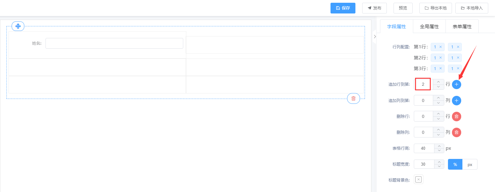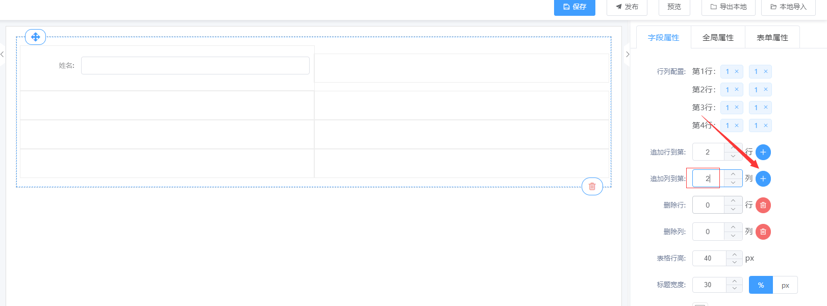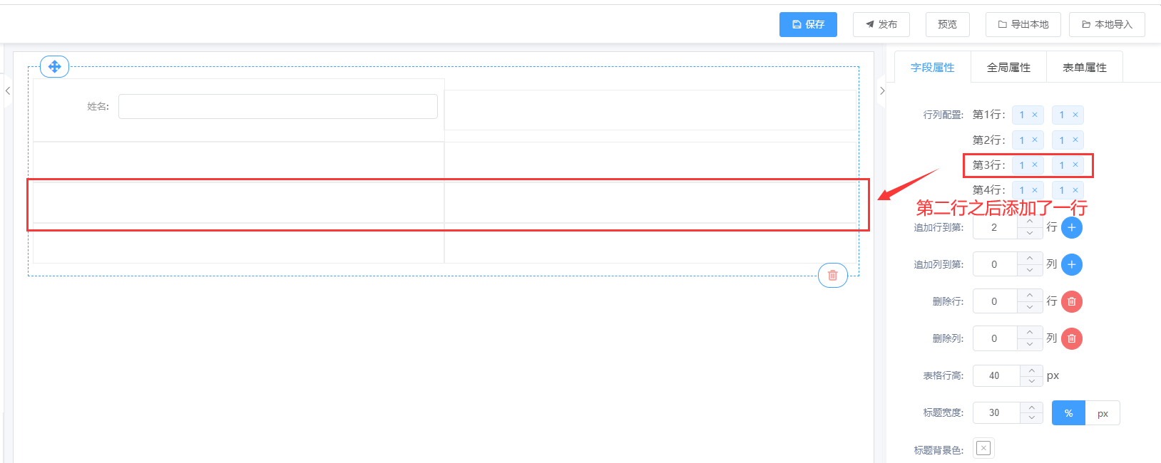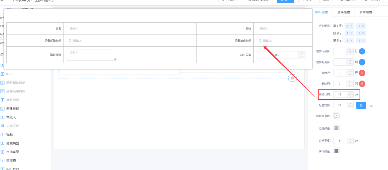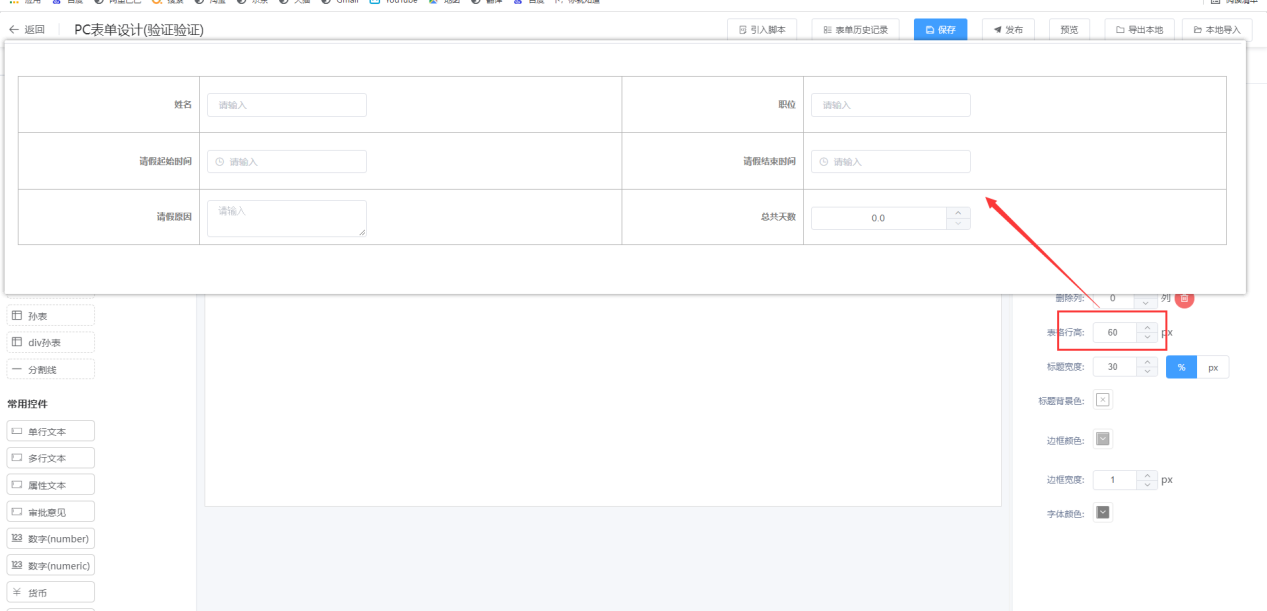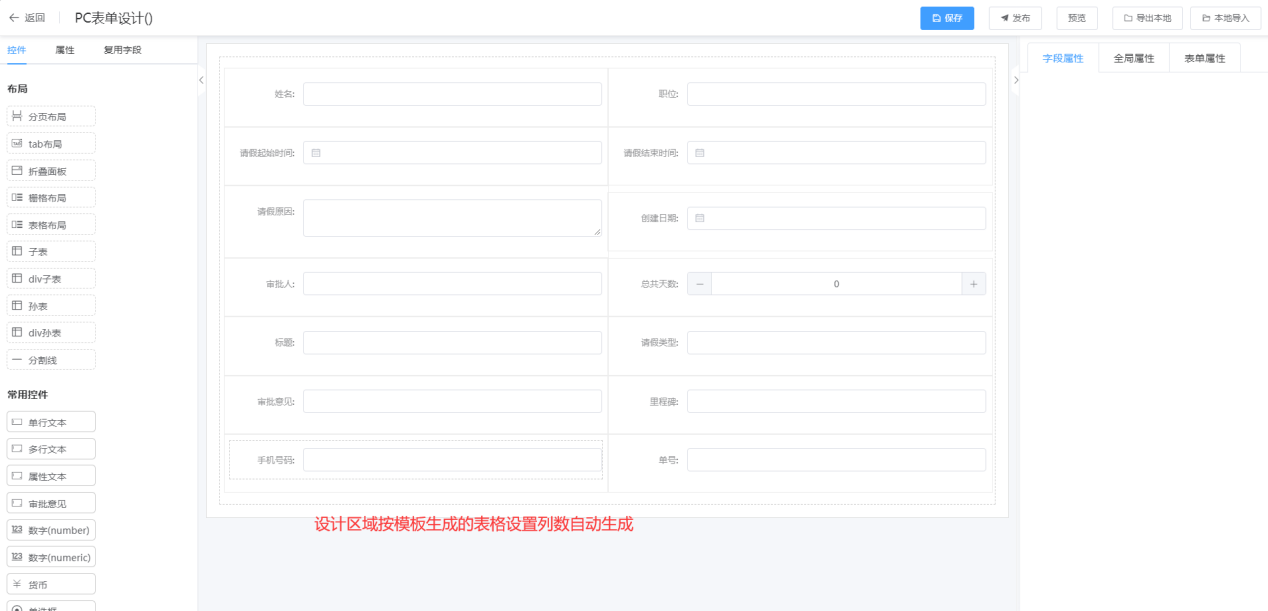 ② 在表单设计页面直接拖拉“表格布局”控件到设计其区域;