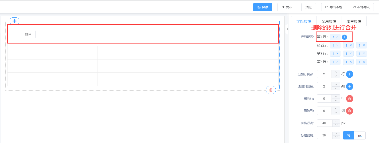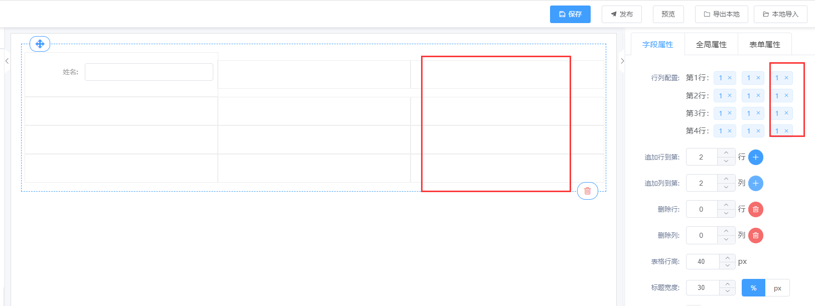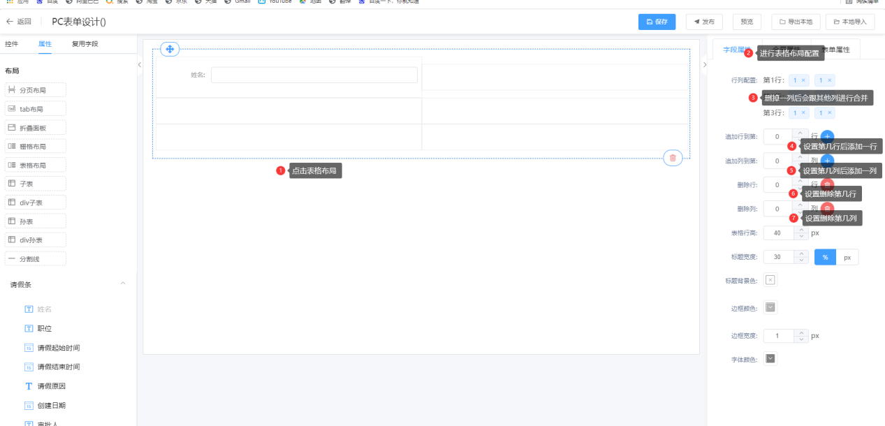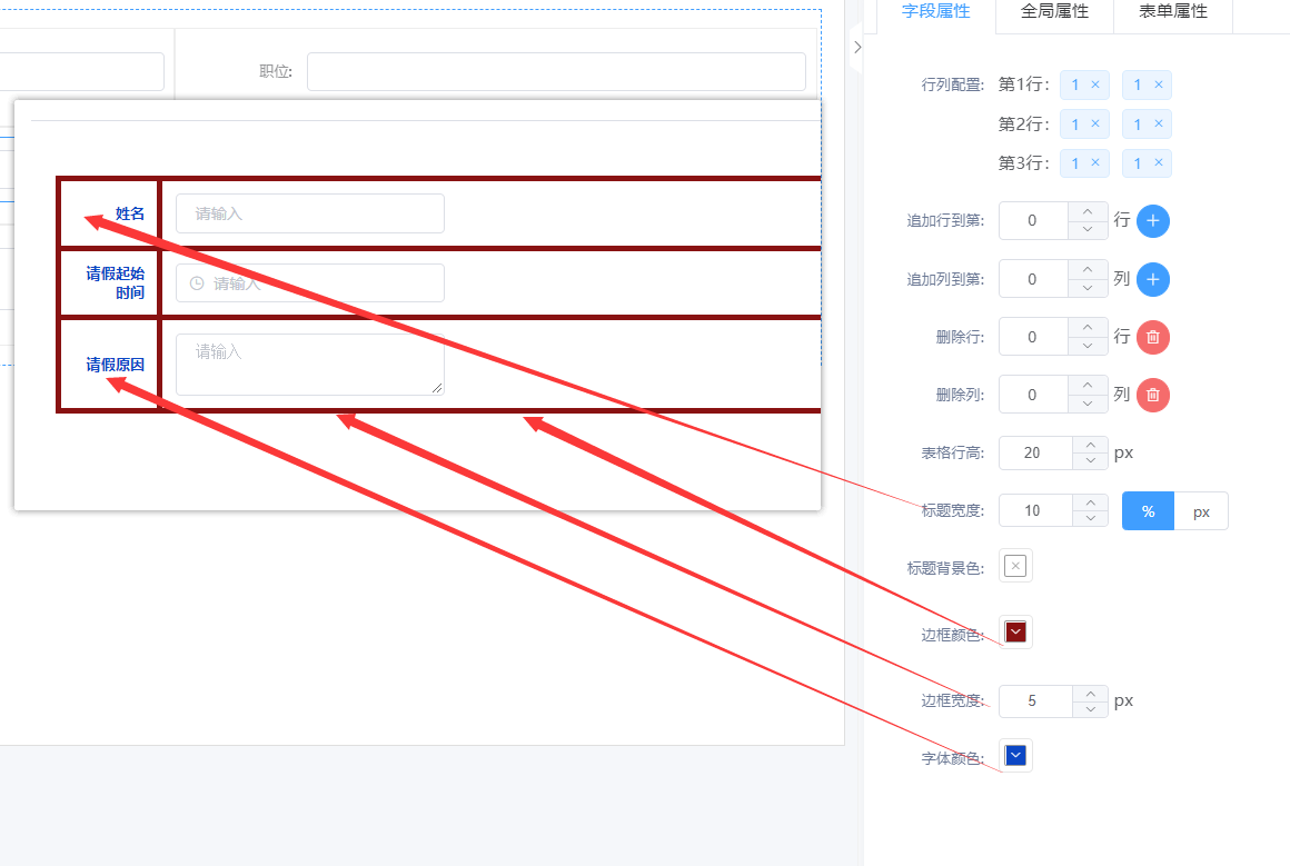 ③ 表格属性说明:行列配置