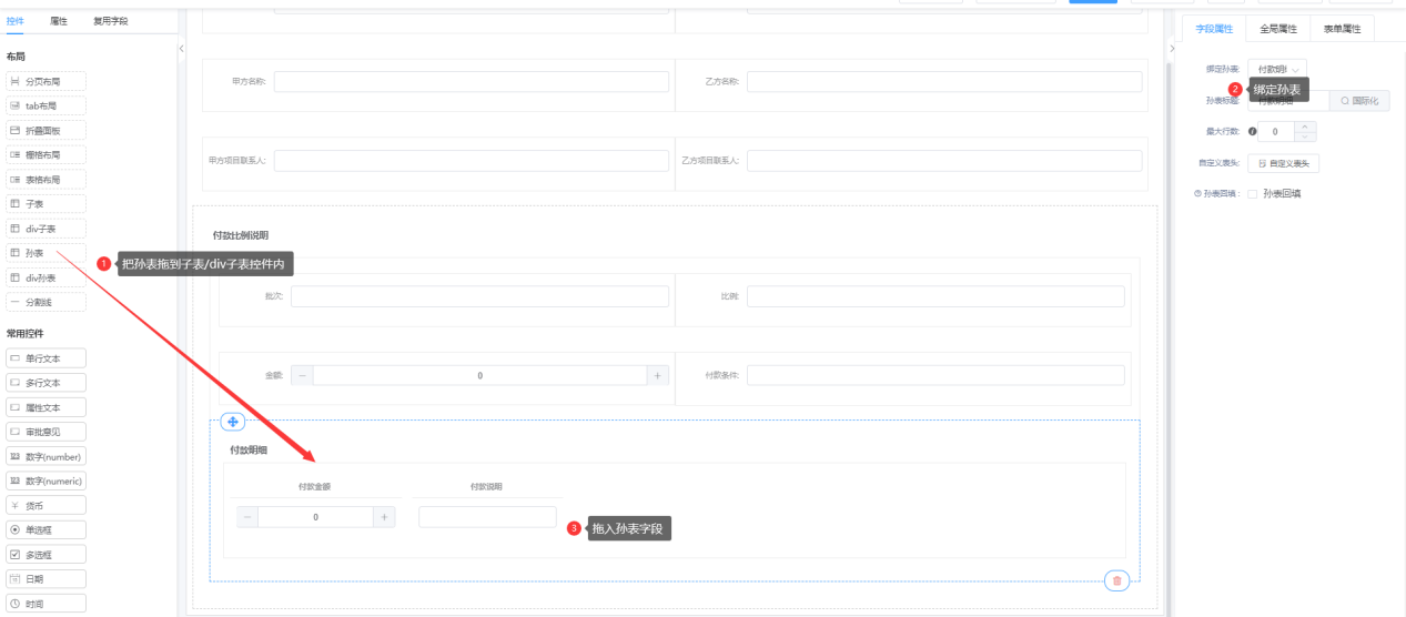 第一步:进入表单设计器页面,将孙表拖拉到表单设计区域;