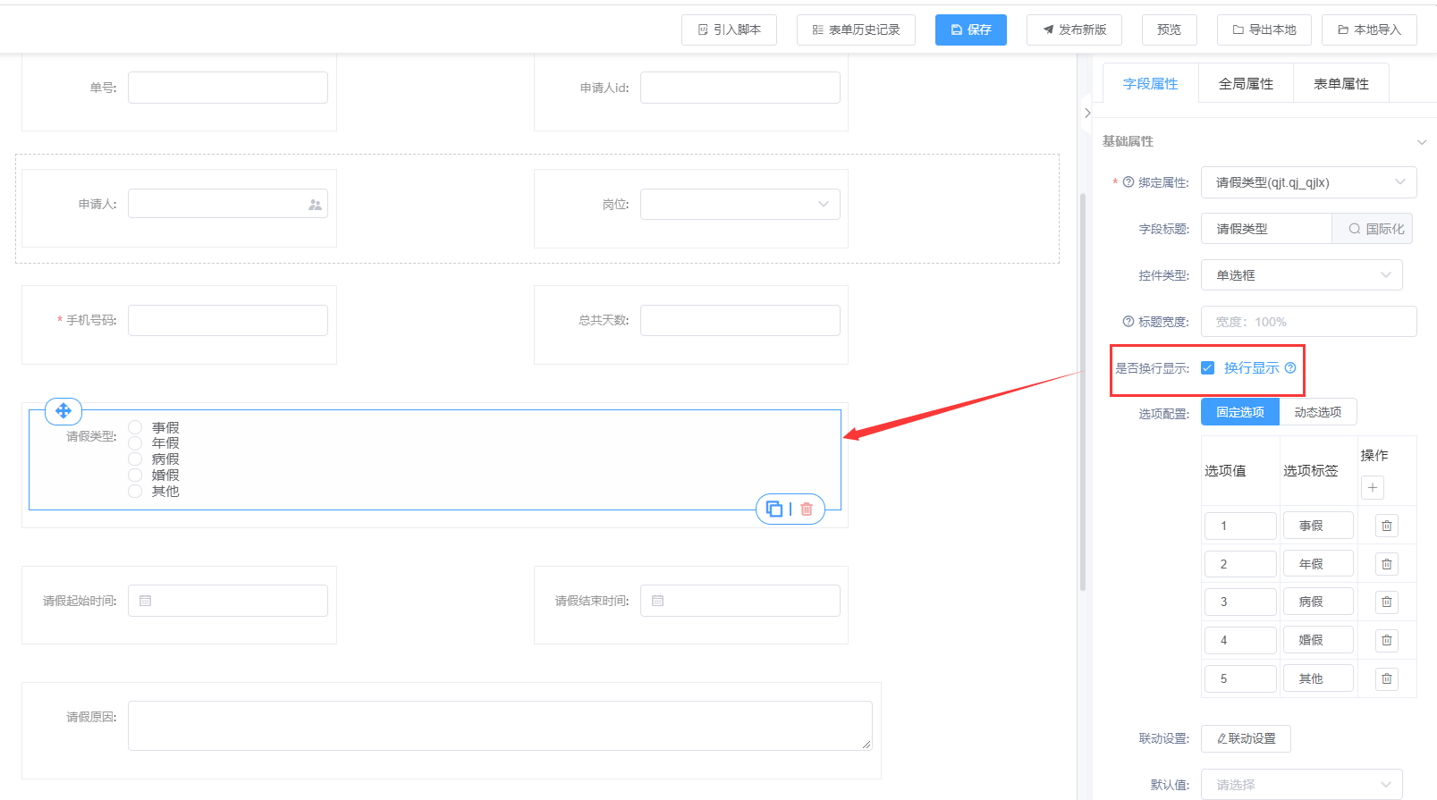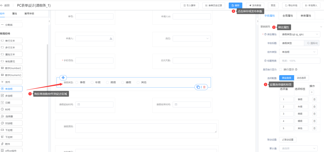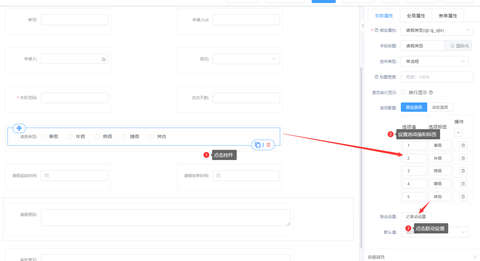 例:请假类型选项有:事假、病假、婚假、年假、其他