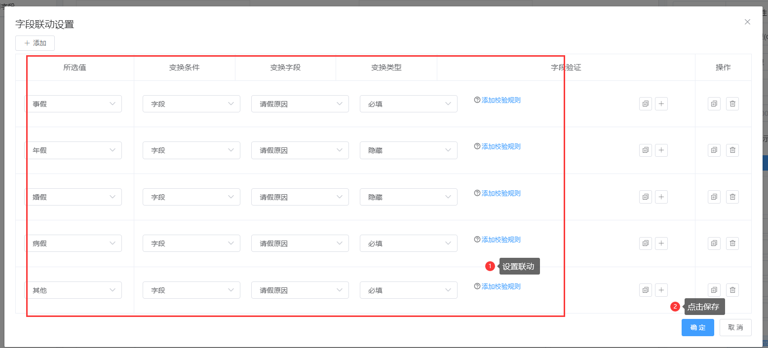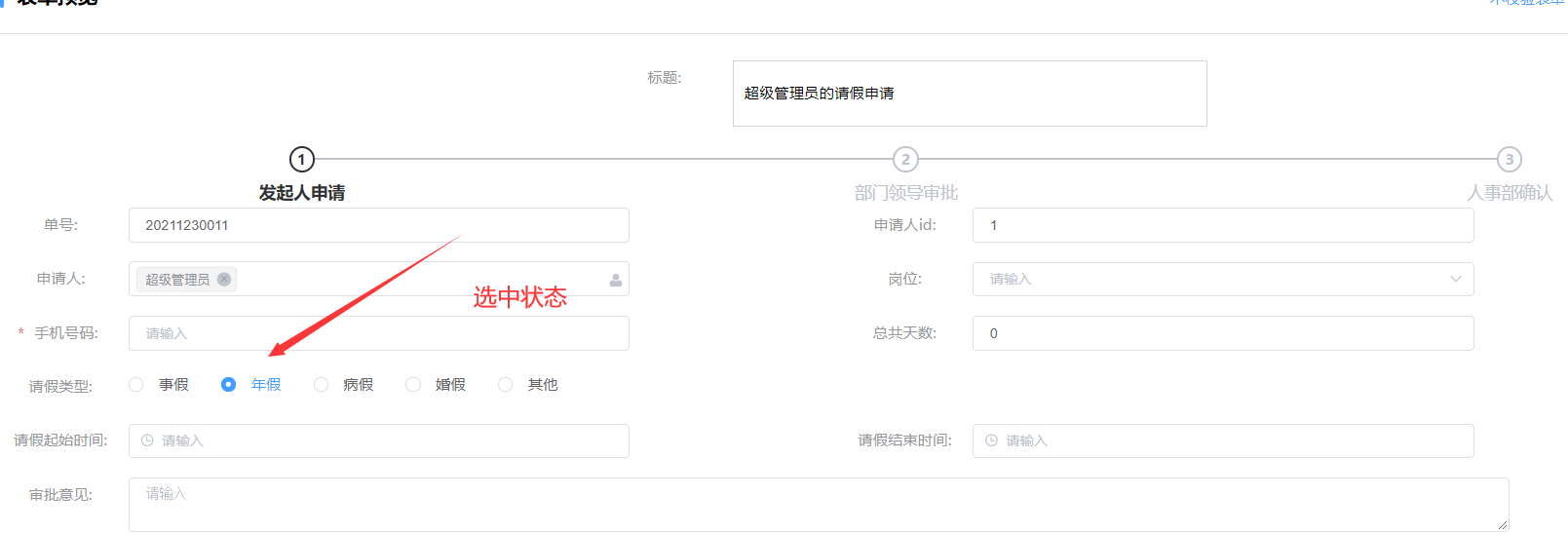 场景1:请假申请单中请假类型选择其他时,“请假事由”为必填,选择“年假或婚假”时,“请假事由”隐藏