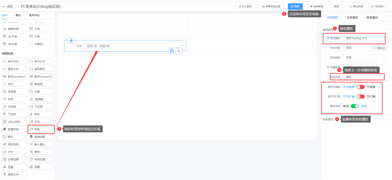 第二步:进入表单页面,将对应字段设置为标签控件,并绑定对应的标签分类