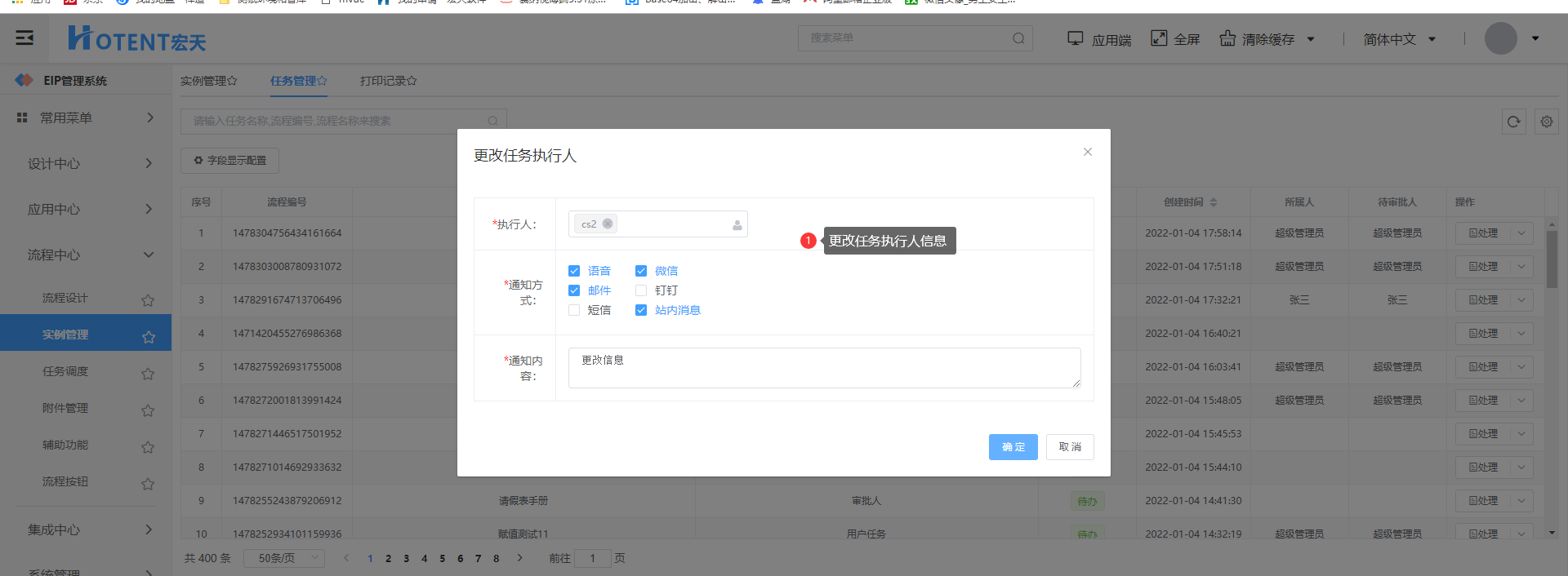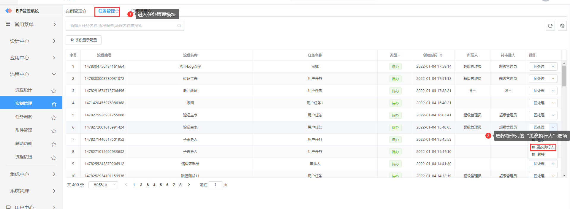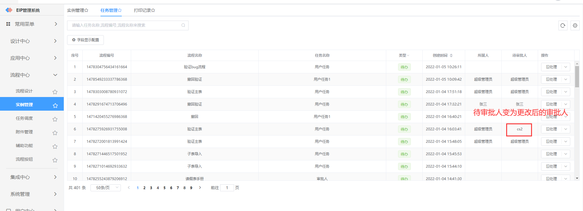 执行人更改后,该流程的待办信息将显示在修改后的执行人待办列表中;