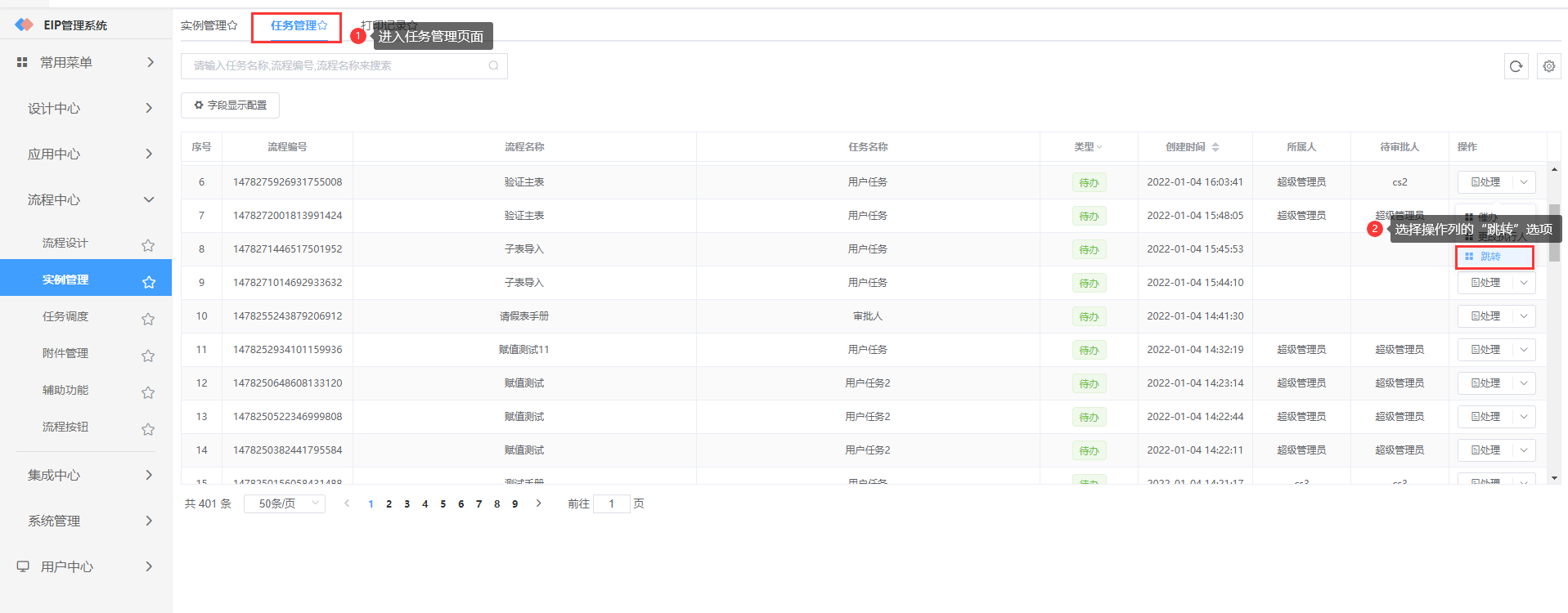 当需要选择要跳转的审批节点时,选择【任务管理】的操作列下方的跳转选项,操作如下: