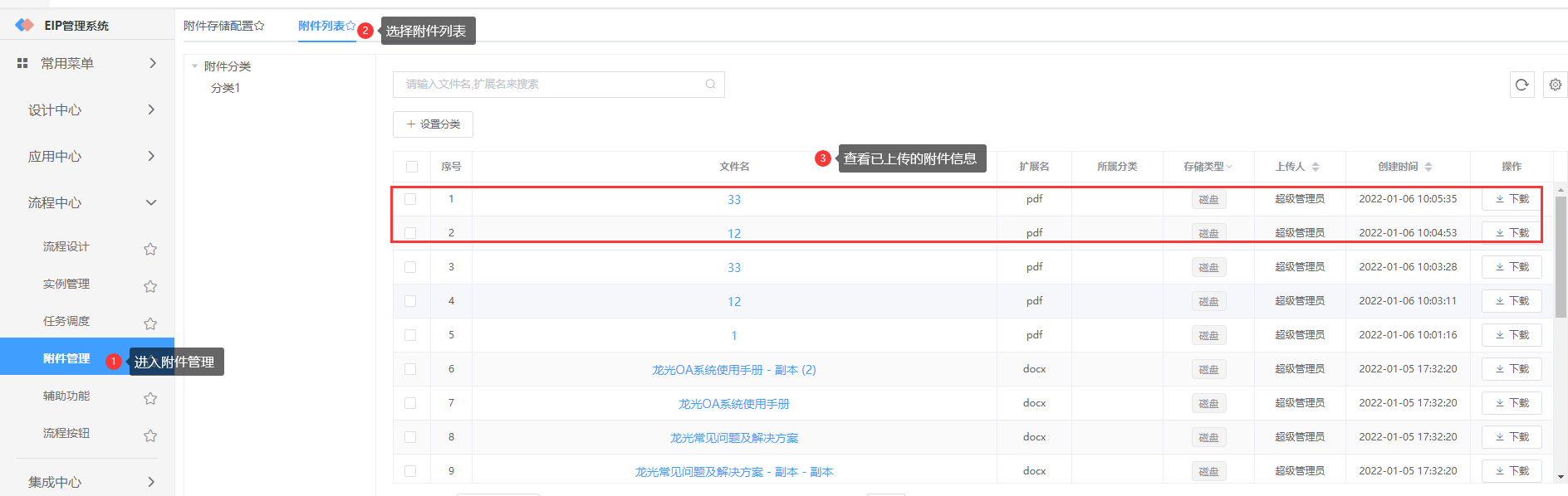 ,上传的附件,都会显示在附件列表中,进行统一的管理;