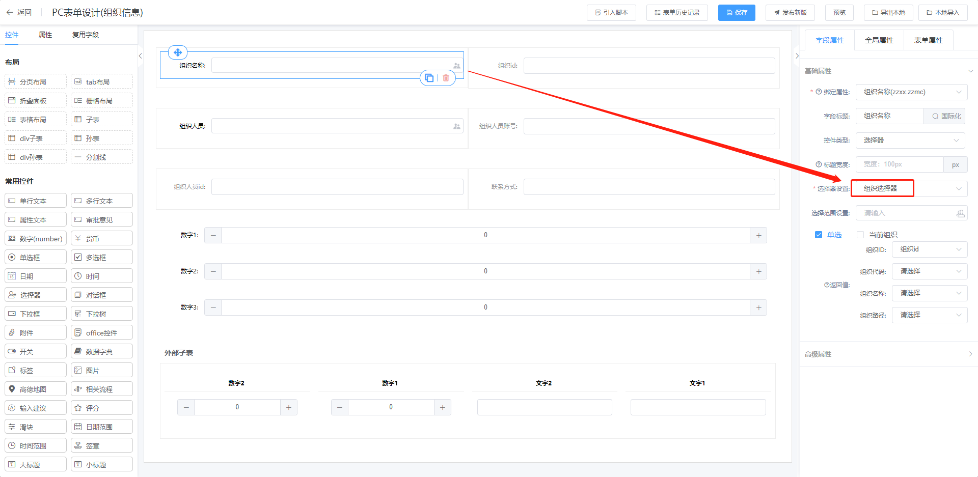 基于业务建模发布后在表单设计页面拖拽控件并进行相关配置,配置完毕后保存并发布表单。