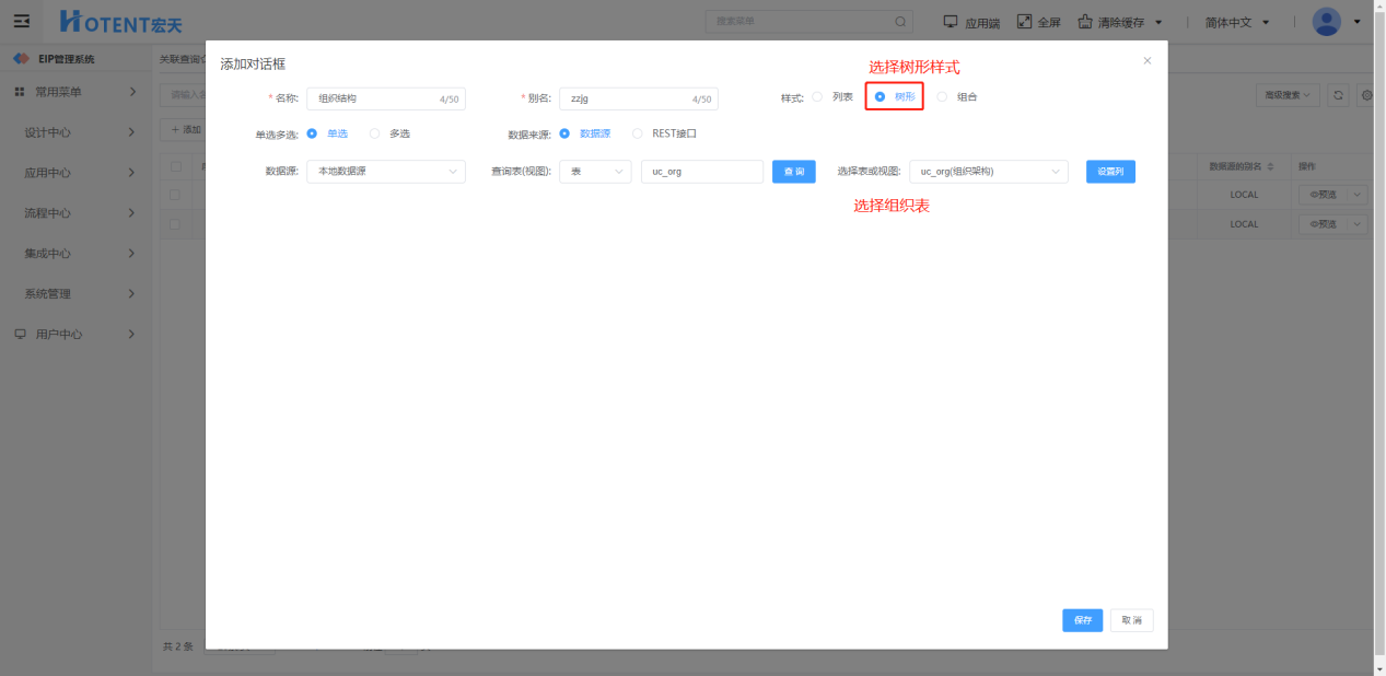 前提条件:需要先配置对应的树形对话框,列表数据需要有一个字段的内容与树形对话框对应上