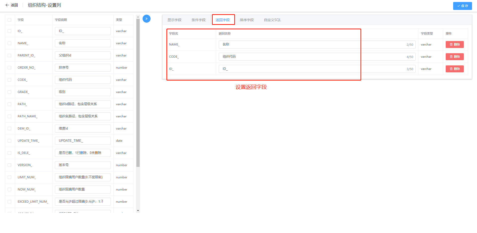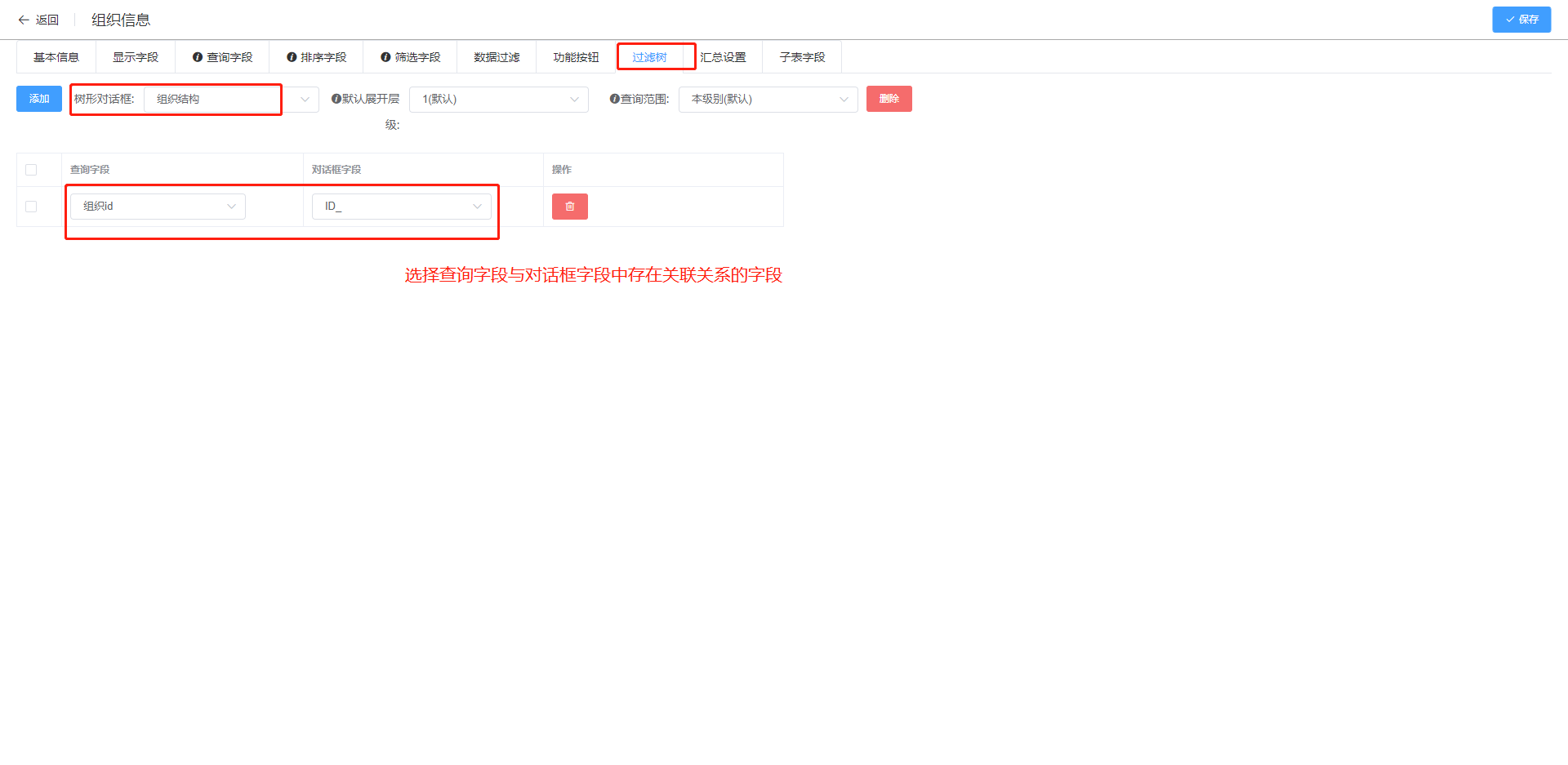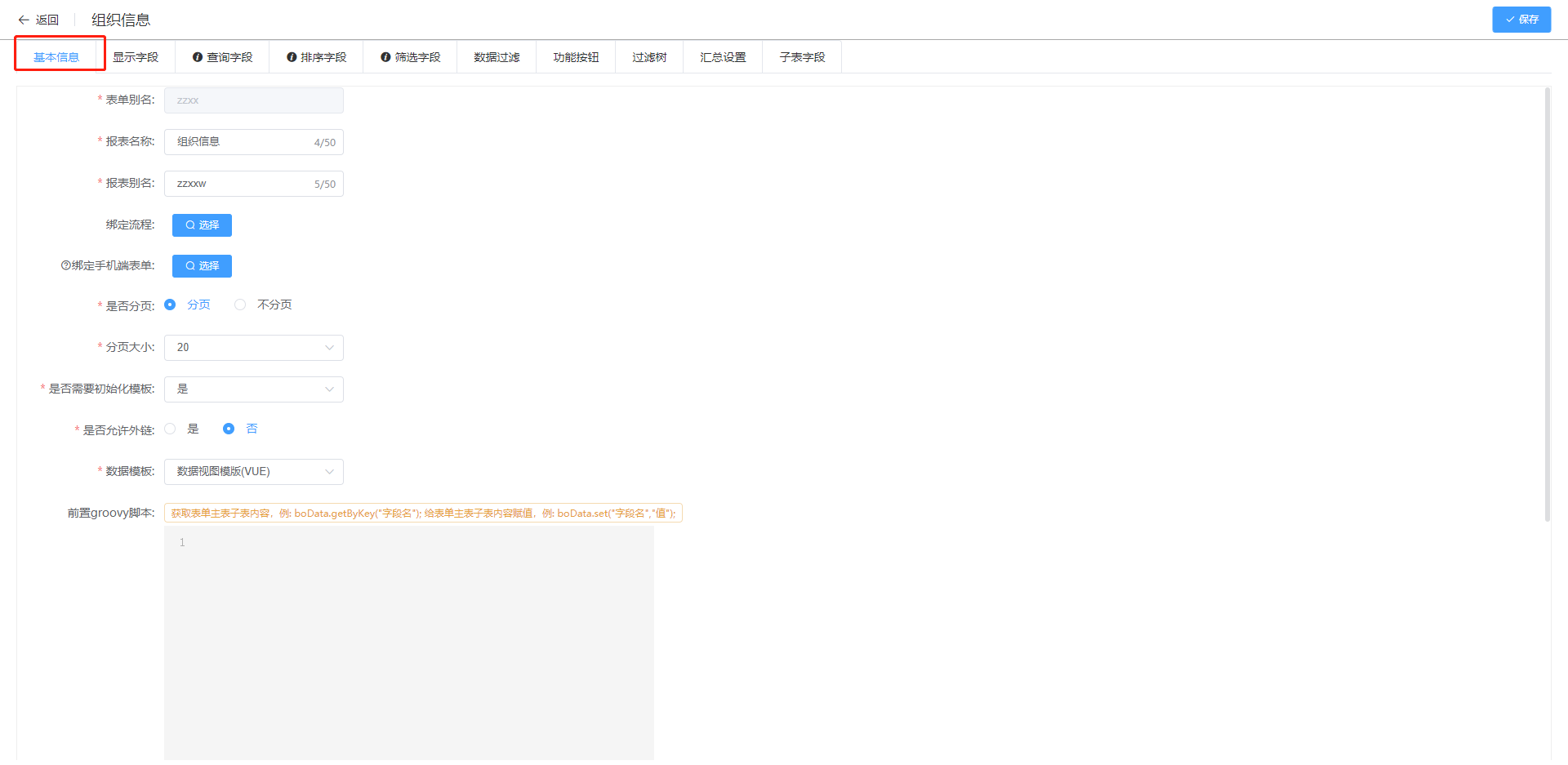 设置显示字段、条件字段等,设计完毕后点击右上角保存。