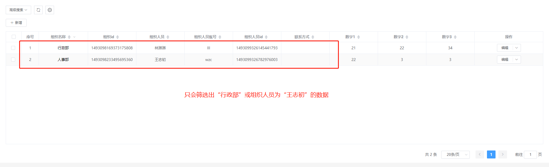 实例:筛选组织名称为行政部或组织人员为王志初的数据