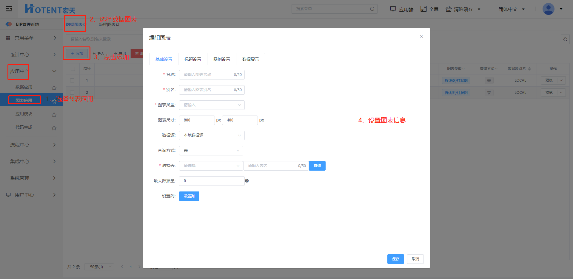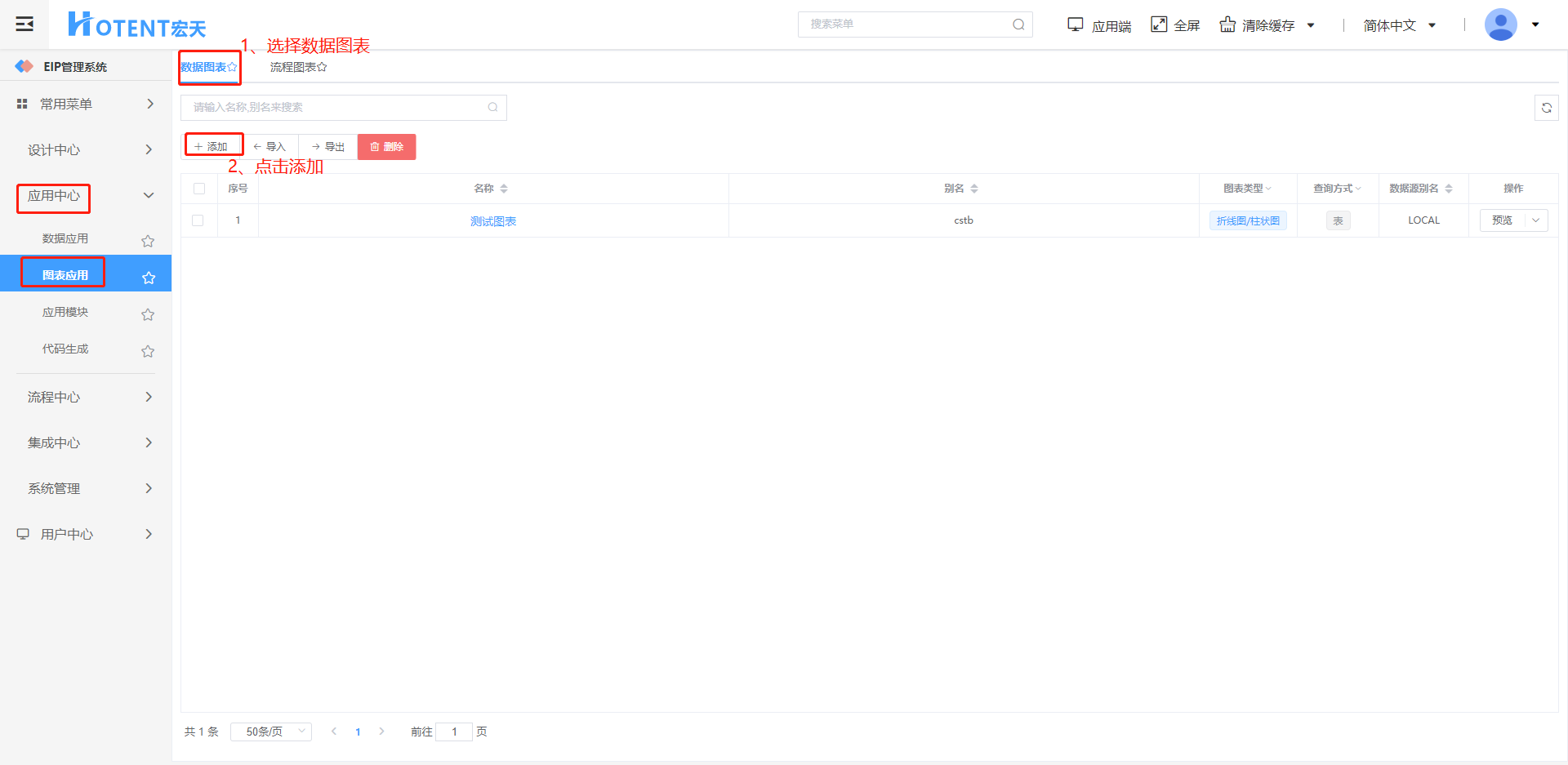第一步:【应用中心】→【图表应用】→【数据图表】,单击“添加”;