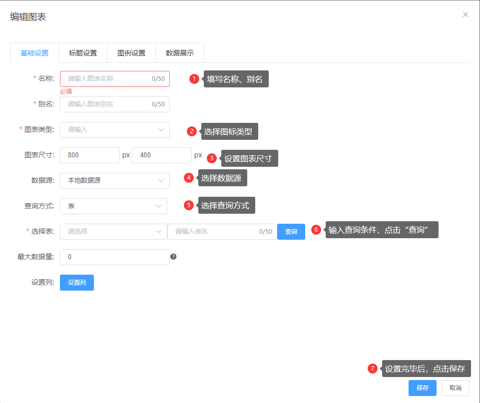 1、 名称:设置图表的名称(必填,填写名称后,别名会根据输入的名称首字母自动生成);