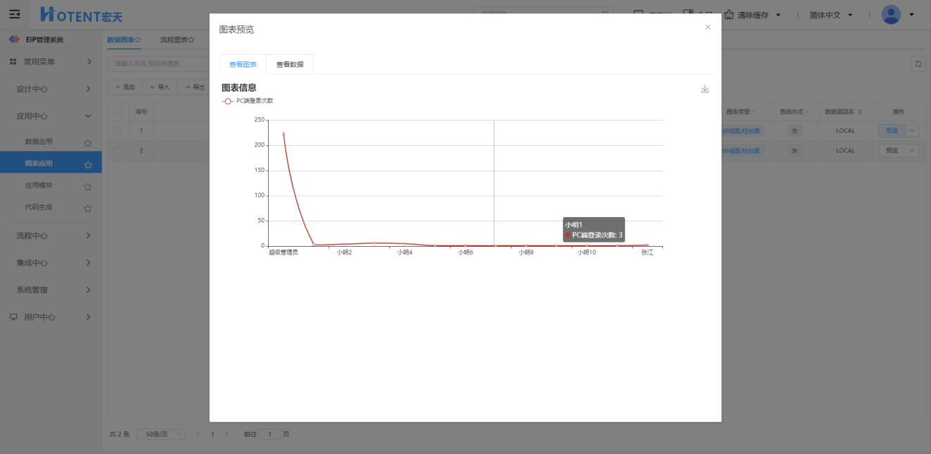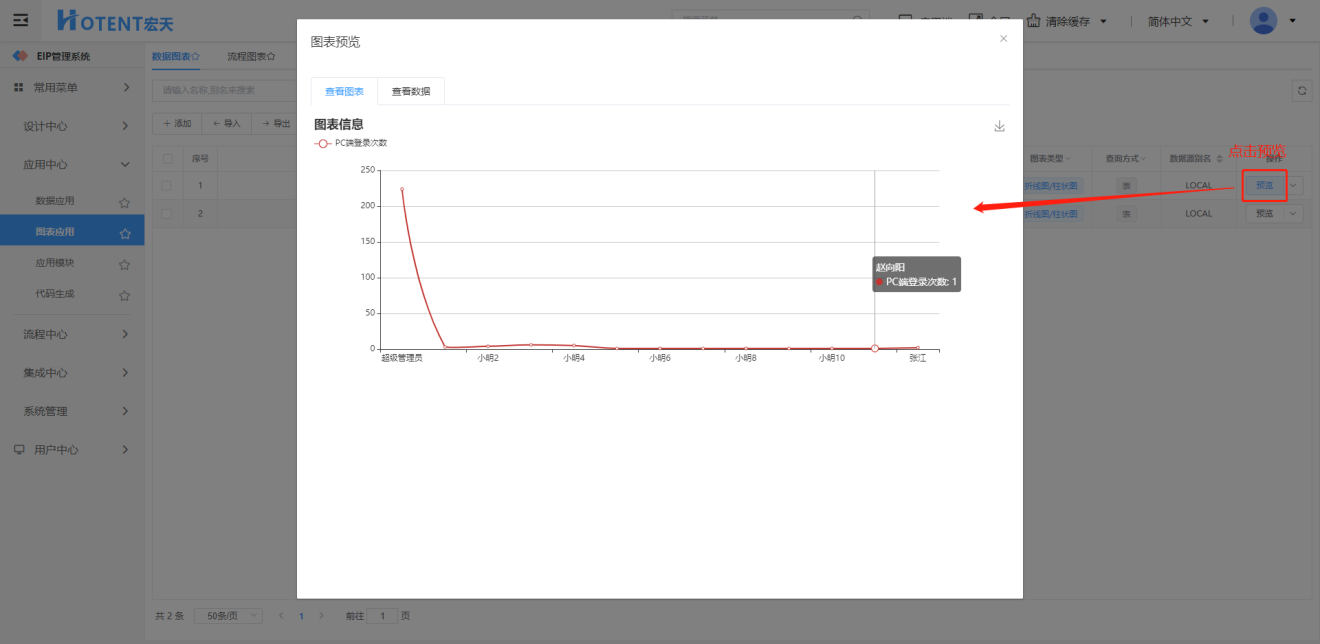 【应用中心】→【图表应用】→【数据图表】,选择要预览的图表,点击操作列下的“预览”按钮;