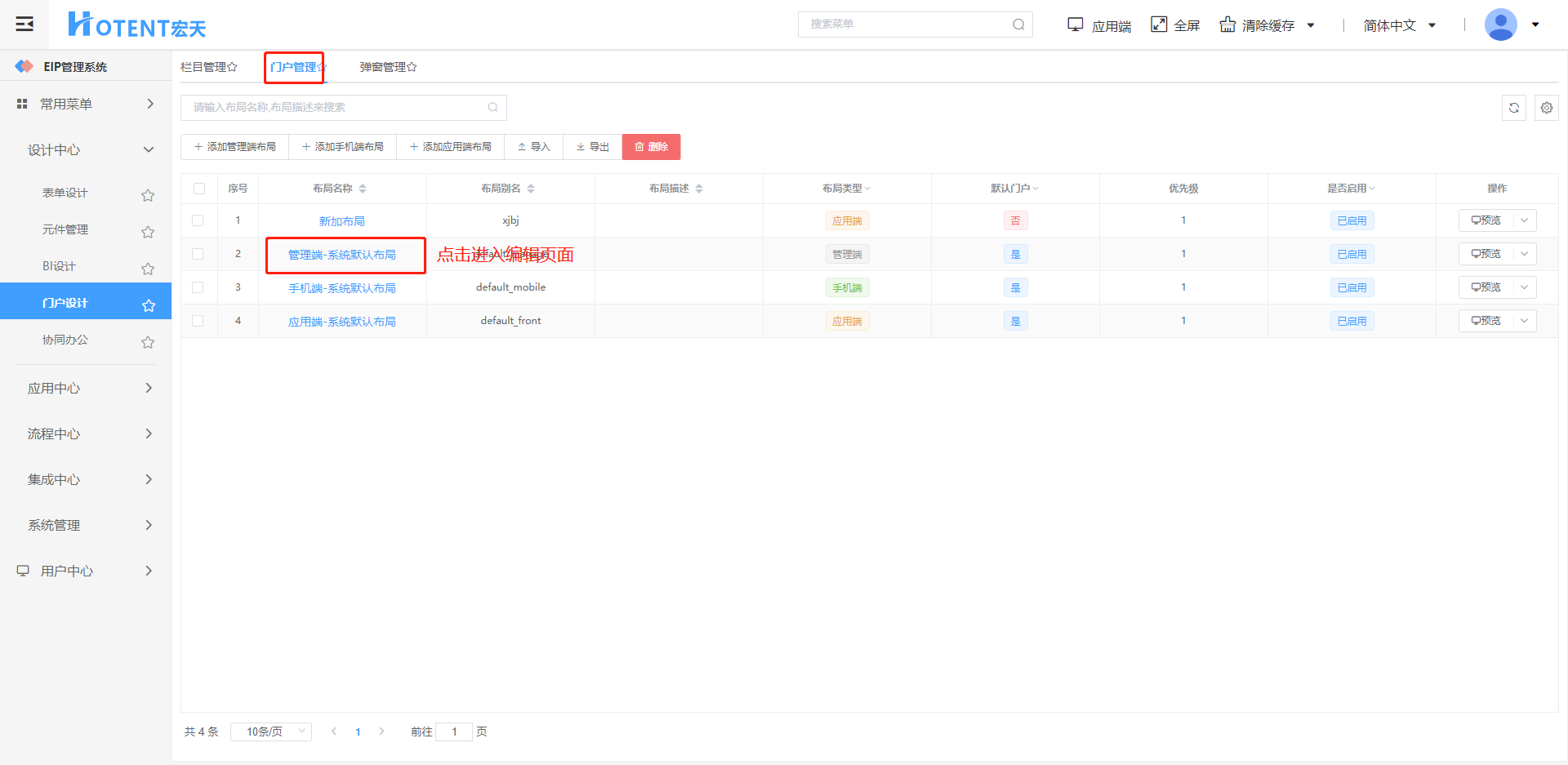 第六步:点击右侧的【门户管理→【管理端-系统默认布局】,在门户首页设计器中可以看到之前添加好的栏目,把栏目拖入表单中,点击保存退出设计页面