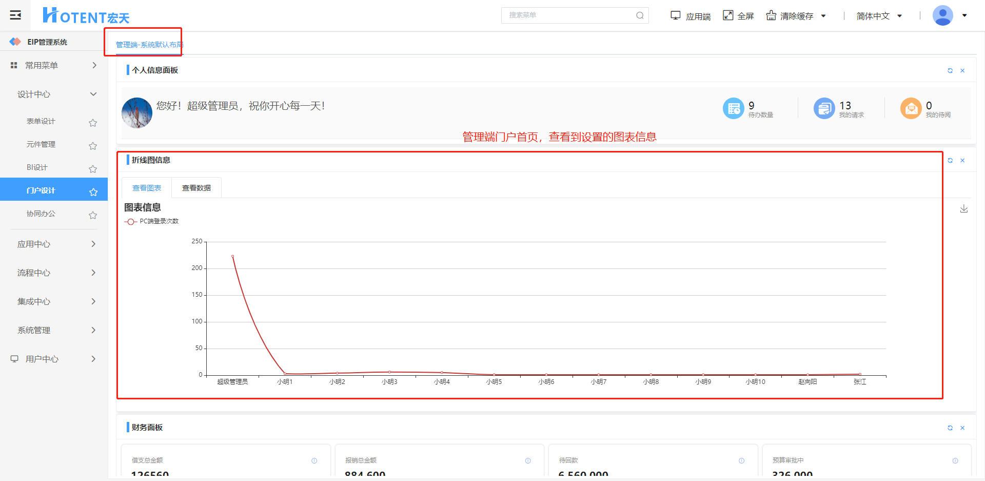 第七步:退出系统重新登录,展示的首页中就可以看到折线图