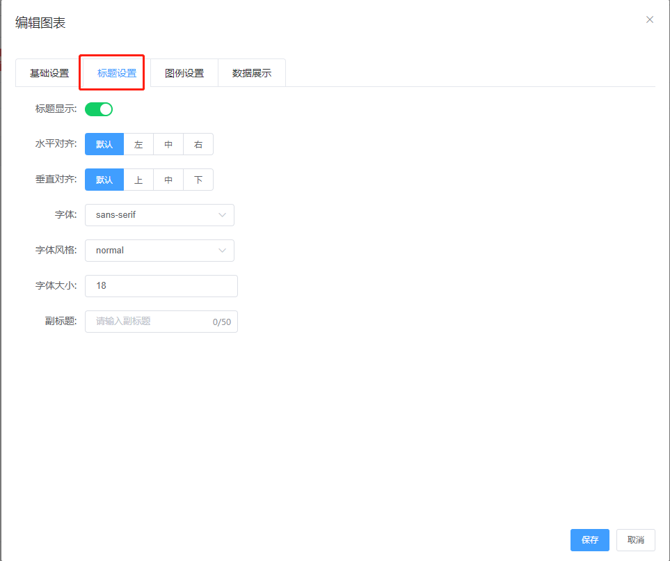 标题配置:即设置图表的标题及显示的位置、标题的字体风格、大小等属性如下图: