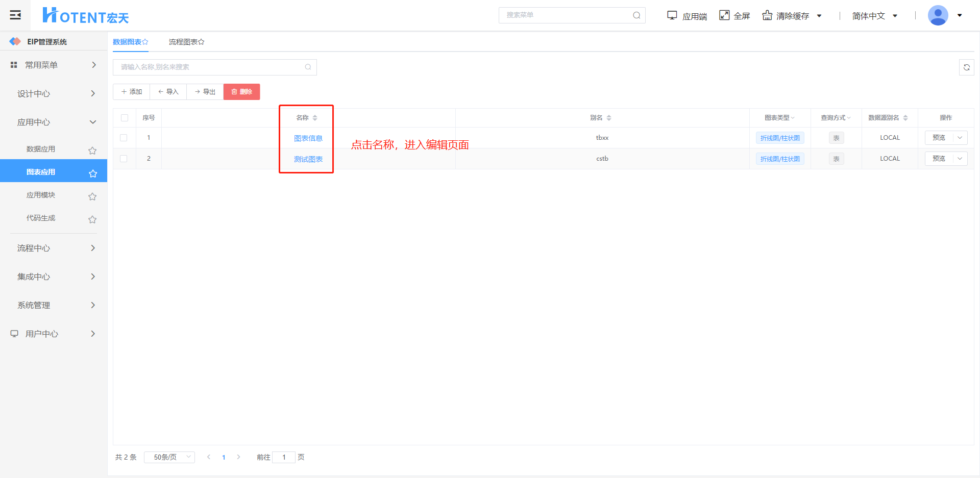 第一步:【应用中心】→【图表应用】→【数据图表】,点击要编辑的图表名称;