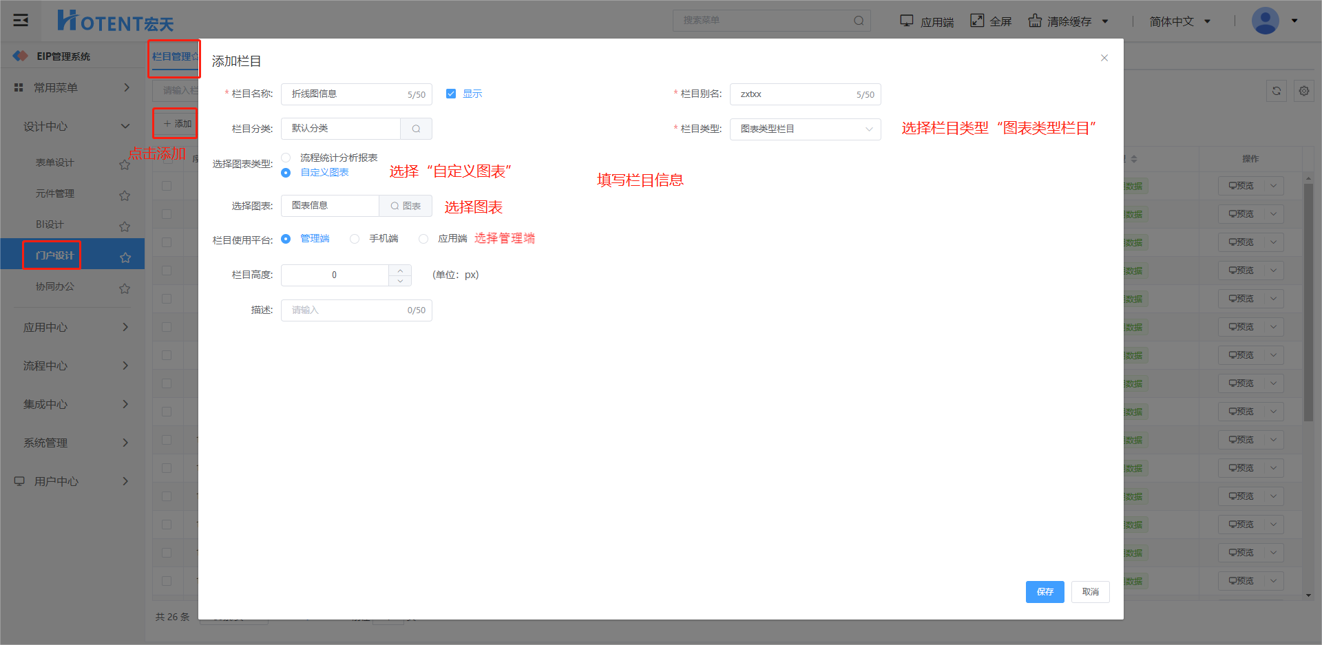 第五步:点击【设计中心】→【门户设计】→【栏目管理】,添加一个管理端的栏目用来展示这个折线图
