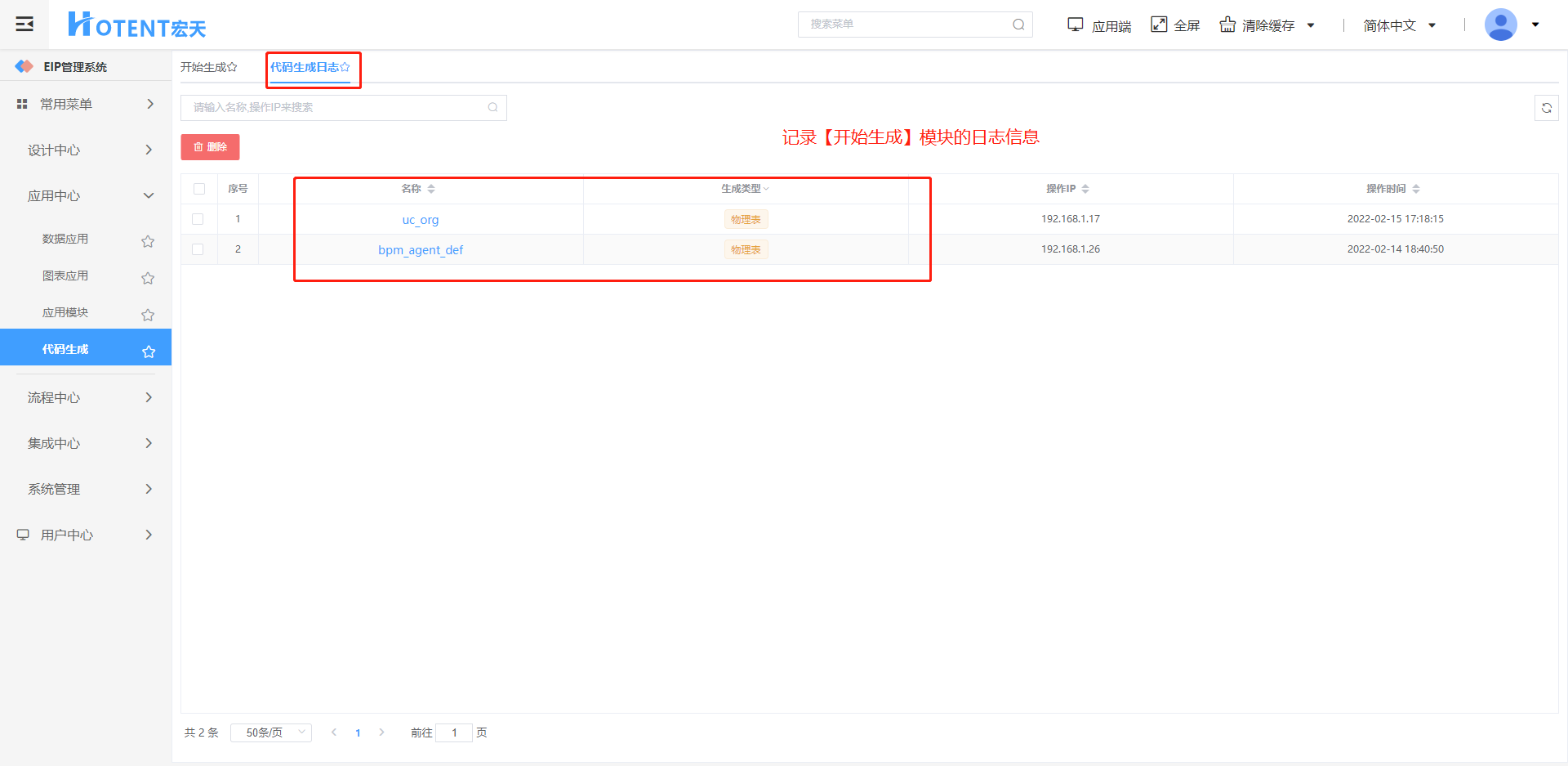 记录【开始生成】中生成代码的日志信息。